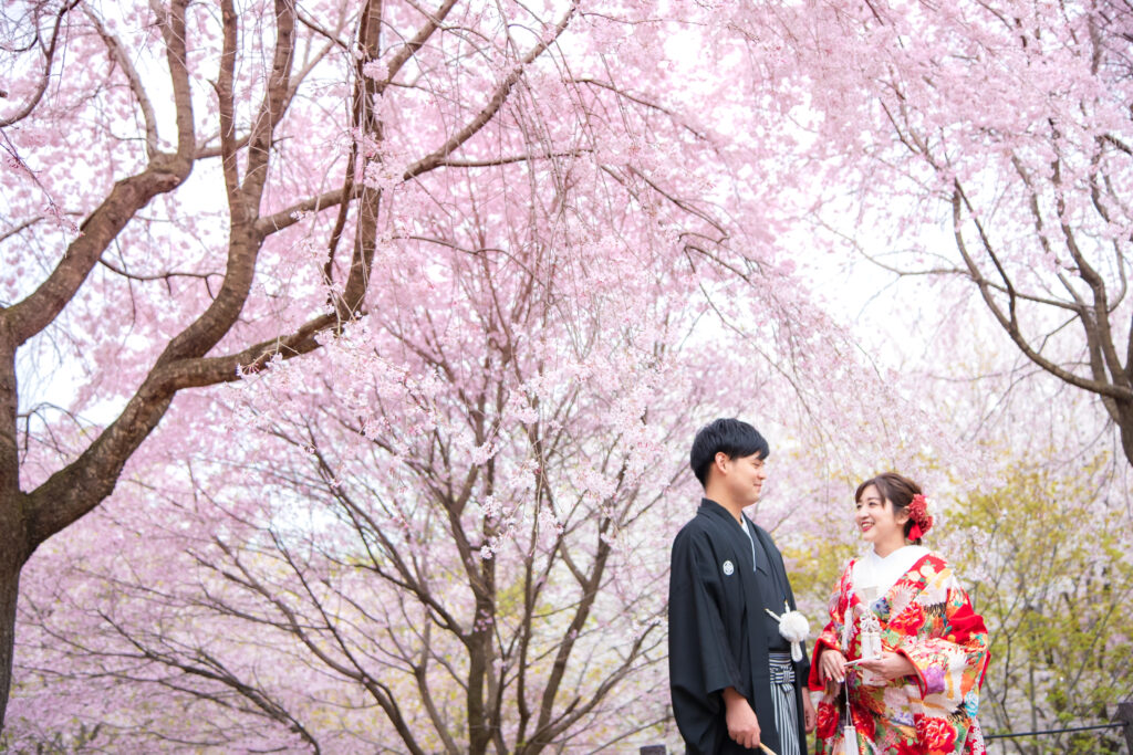 今年の桜の開花は記録的な早さとなりました。桜の時期に撮影される方は、ご自身の撮影日に桜がちゃんと咲いているのか、とても心配になるものです。「桜おまかせプラン」ですは、撮影日に桜が咲いている場所をリサーチして新郎新婦様をお連れいたします。必ず桜と撮影ができる嬉しいプランです。