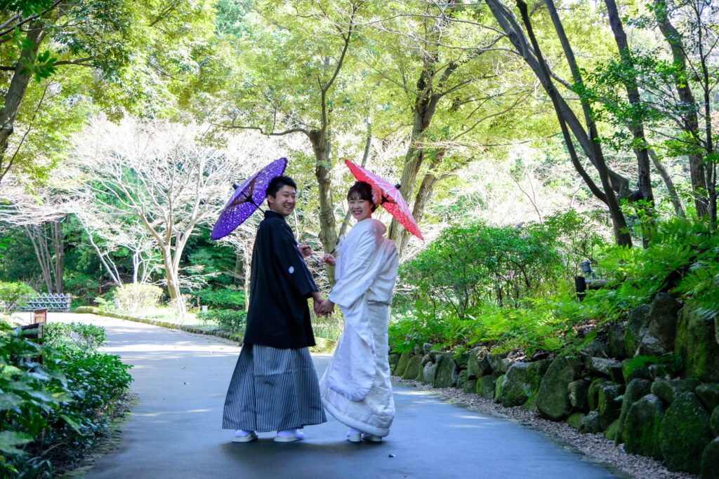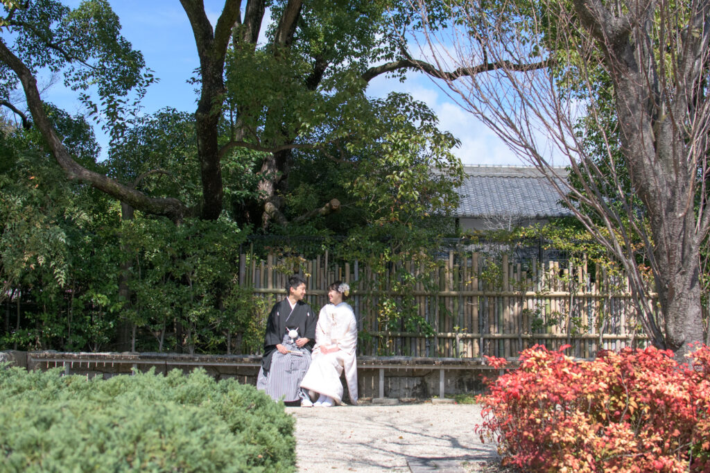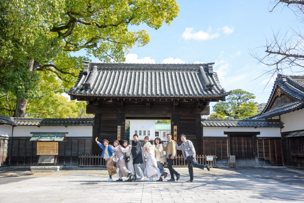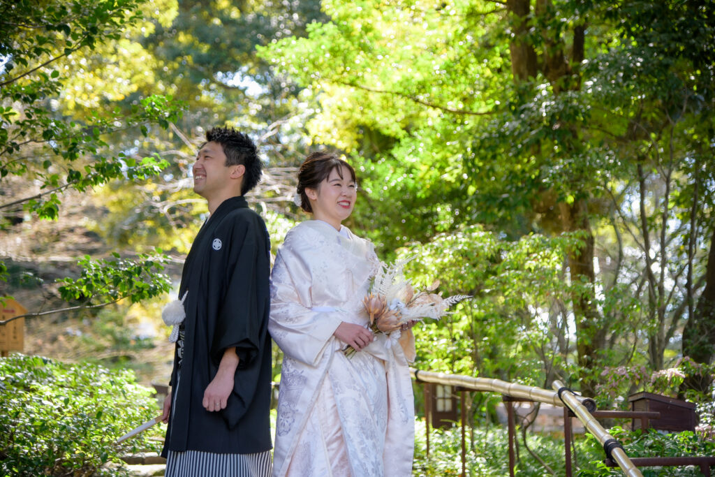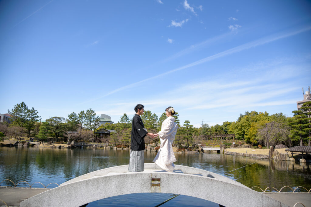 名古屋の和装ロケーション撮影の人気№1スポット「徳川園」池あり、橋あり、川あり、緑あり、お茶室あり(中には入れません)と、和装にロケーションが何でもそろっています。晴天に恵まれ、新郎新婦様のご両親ご家族に見守られながらのにぎやかな撮影になりました。