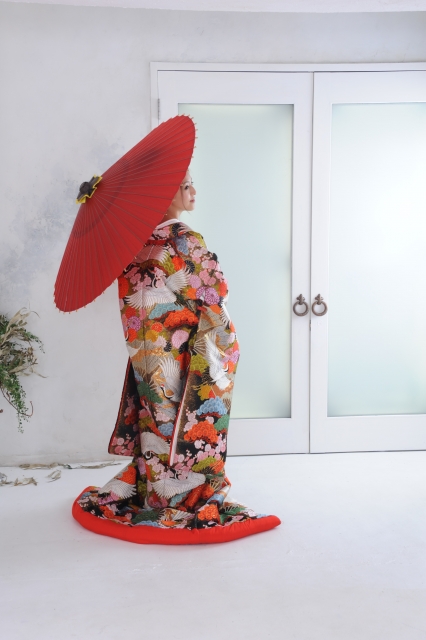 色打掛の正式色は「白、赤、黒」とされています。しかし、最近はピンクや青、緑など他の色も選ばれます。色選びでは自分好みの色よりも、実際に羽織って自分に似合うかどうかで選びましょう。例えば同じ赤色でも、朱色に近い色の方が肌と馴染んで顔色が美しく見えるなんてことも。自分でも思いがけなかった色が似合うこともよくあります。