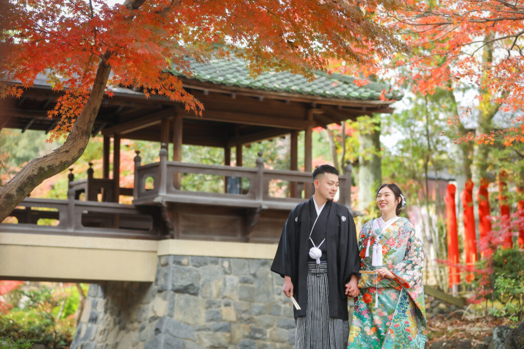 白雲橋の前の紅葉を見てほほ笑む新婦を優しく見守る新郎