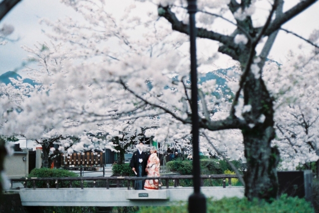 明るく天候の良い春の前撮りで人気なのは、やっぱり桜です。特に和装は桜がよく似合いますね。