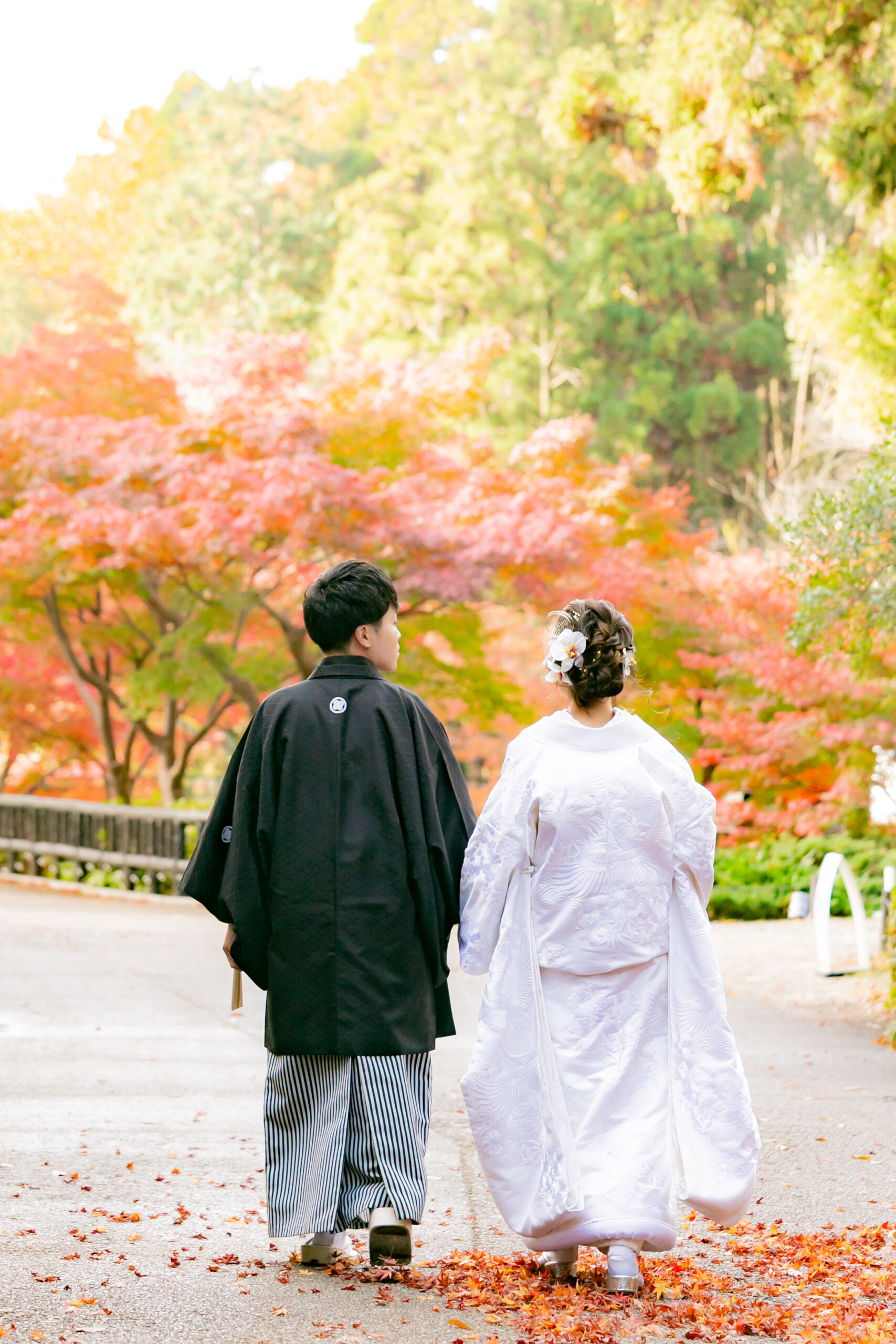 東山植物園宗節庵で紅葉白無垢ロケーションフォト 並んで歩く後ろ姿