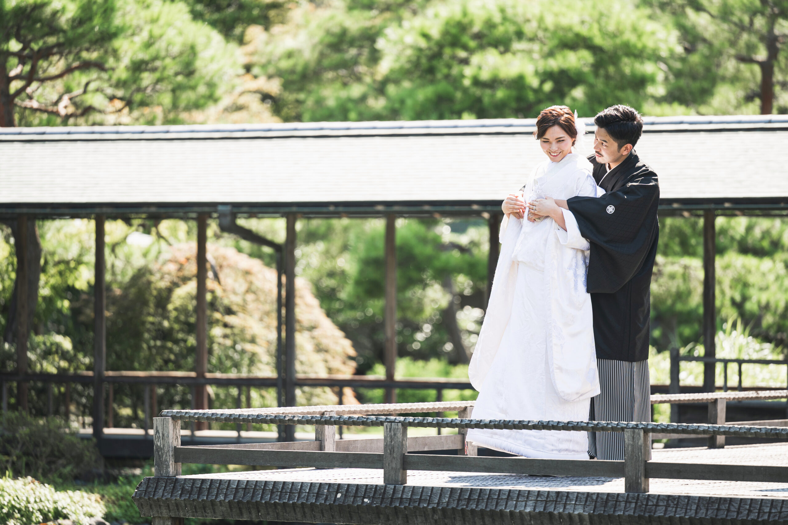 白鳥庭園で白無垢和装前撮りロケーション 新郎が後ろからハグ