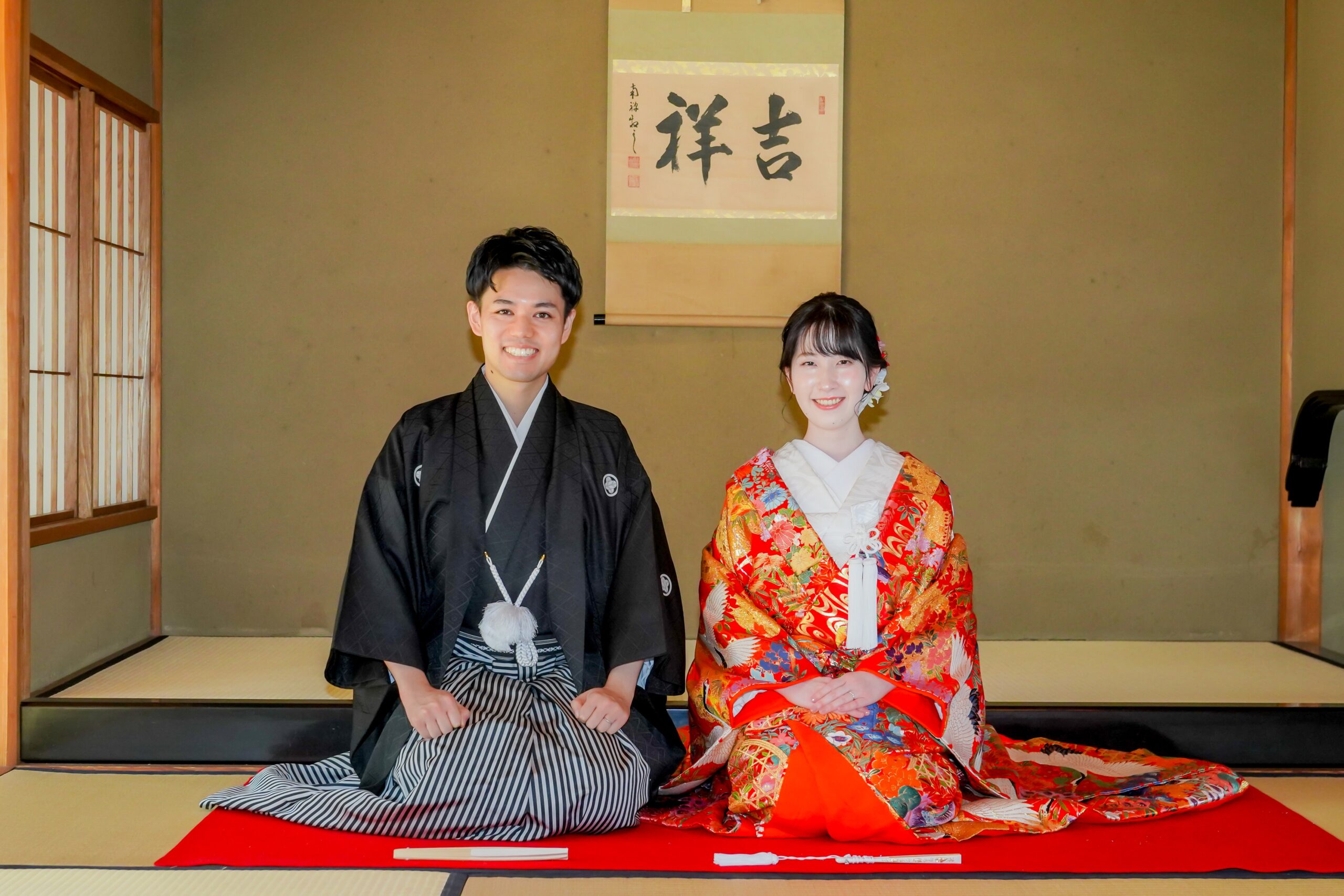 白鳥庭園で前撮りロケーションフォト 赤い色打掛で正座ショット