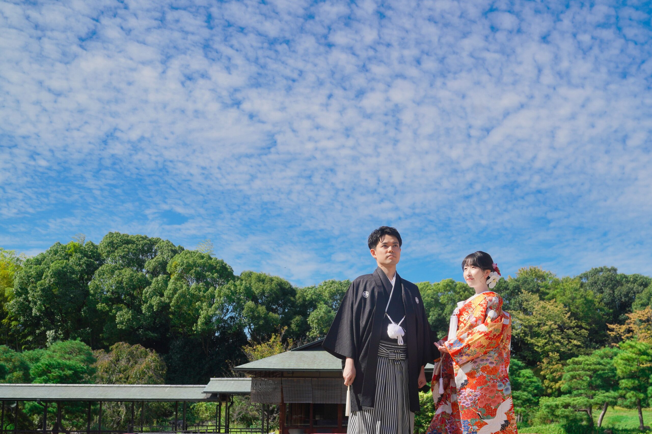 白鳥庭園で前撮りロケーションフォト 和装で空を見上げる