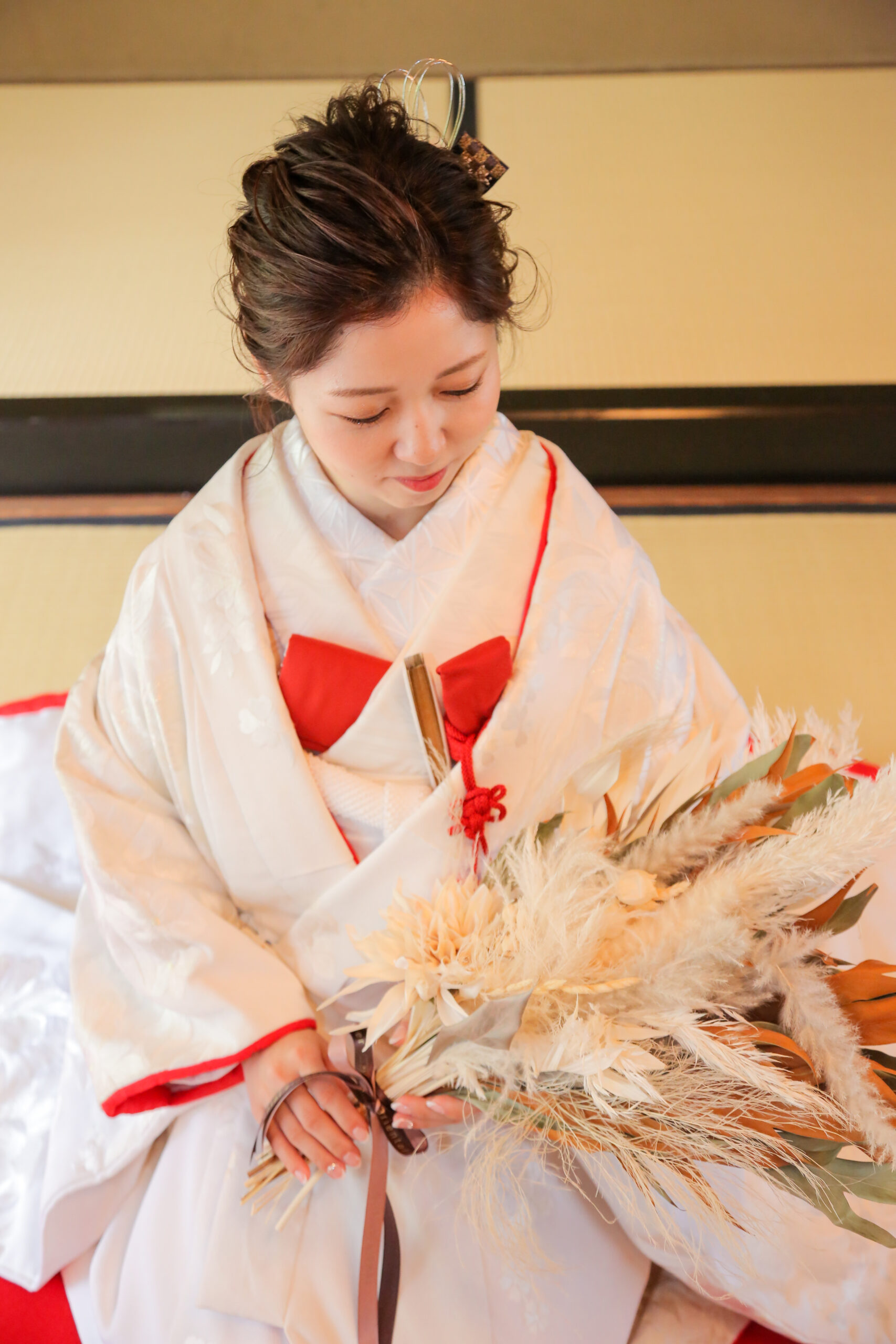 白鳥庭園で和装前撮り 紅葉ロケーションフォト ドライフラワーのブーケを持って座る白無垢花嫁