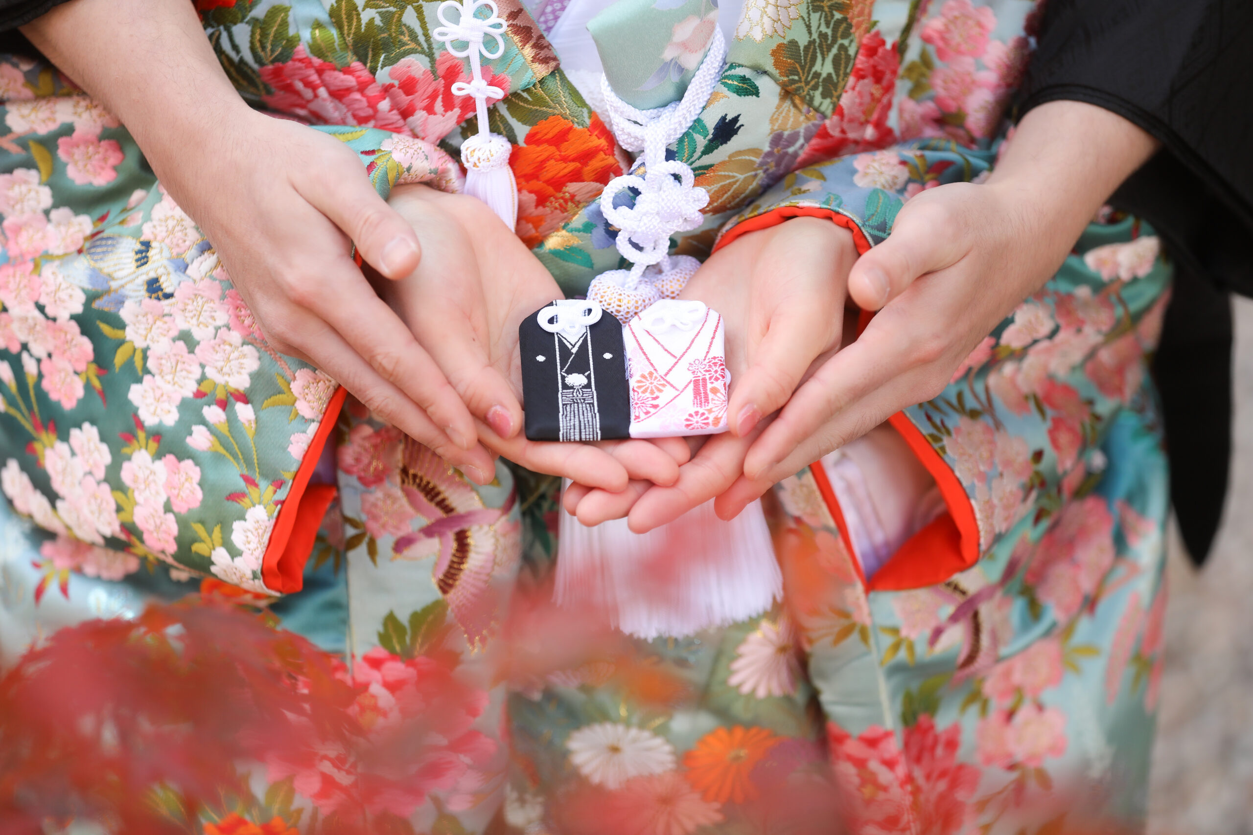 揚輝荘で和装ウェディングフォト 夫婦守りを手に乗せる 手元ショット