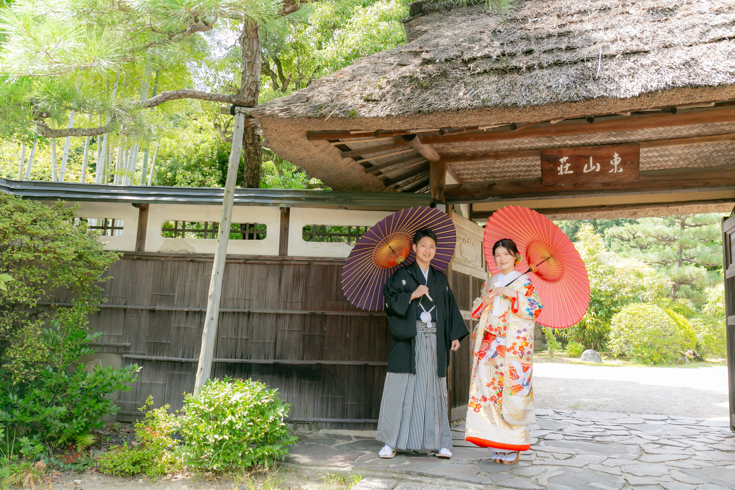 東山荘で和装ウェディングフォト 門の前で和傘をさす新郎新婦 和装ロケーション