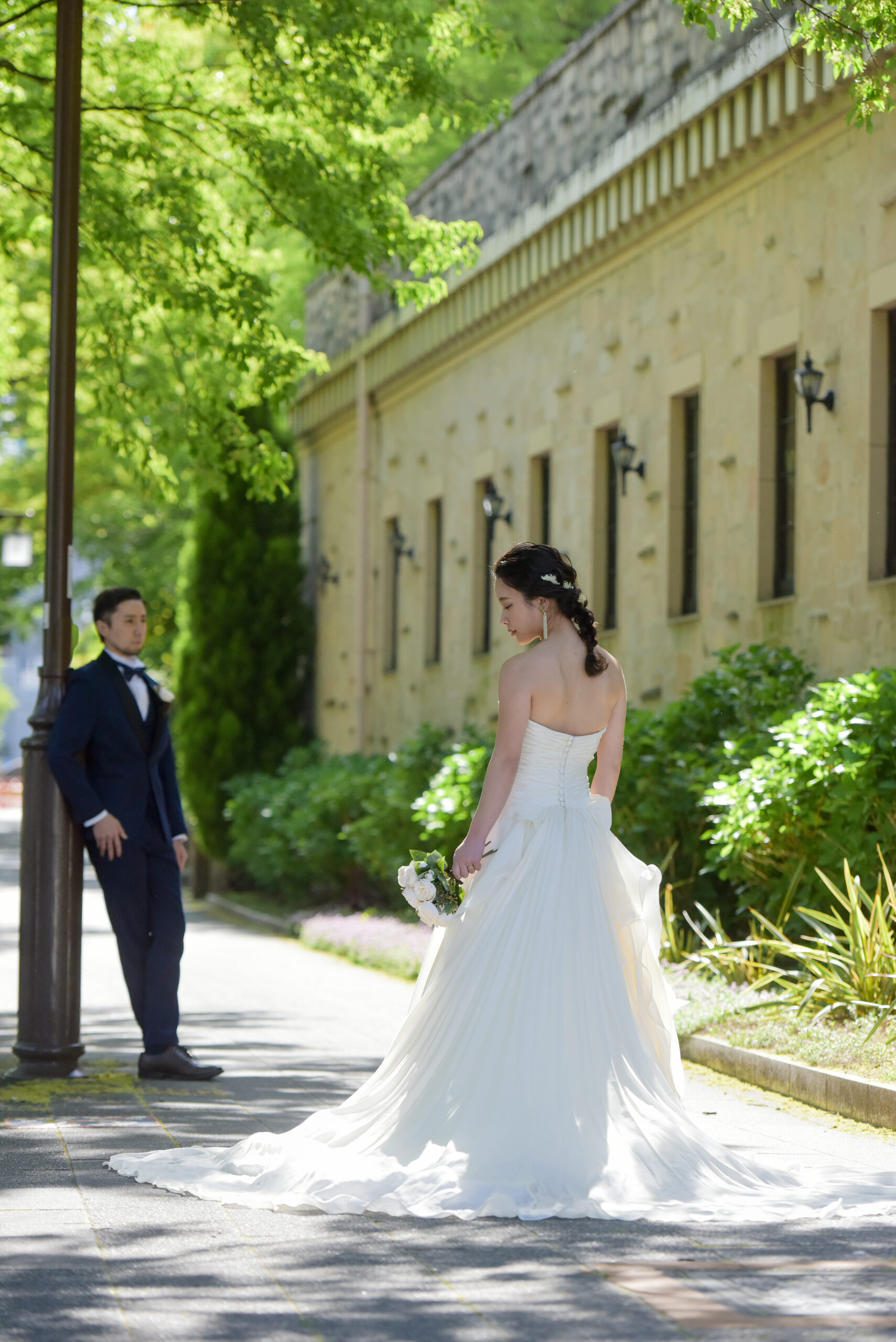 久屋大通庭園フラリエで洋装フォトウェディング ウェディングドレスを着た花嫁の後ろ姿