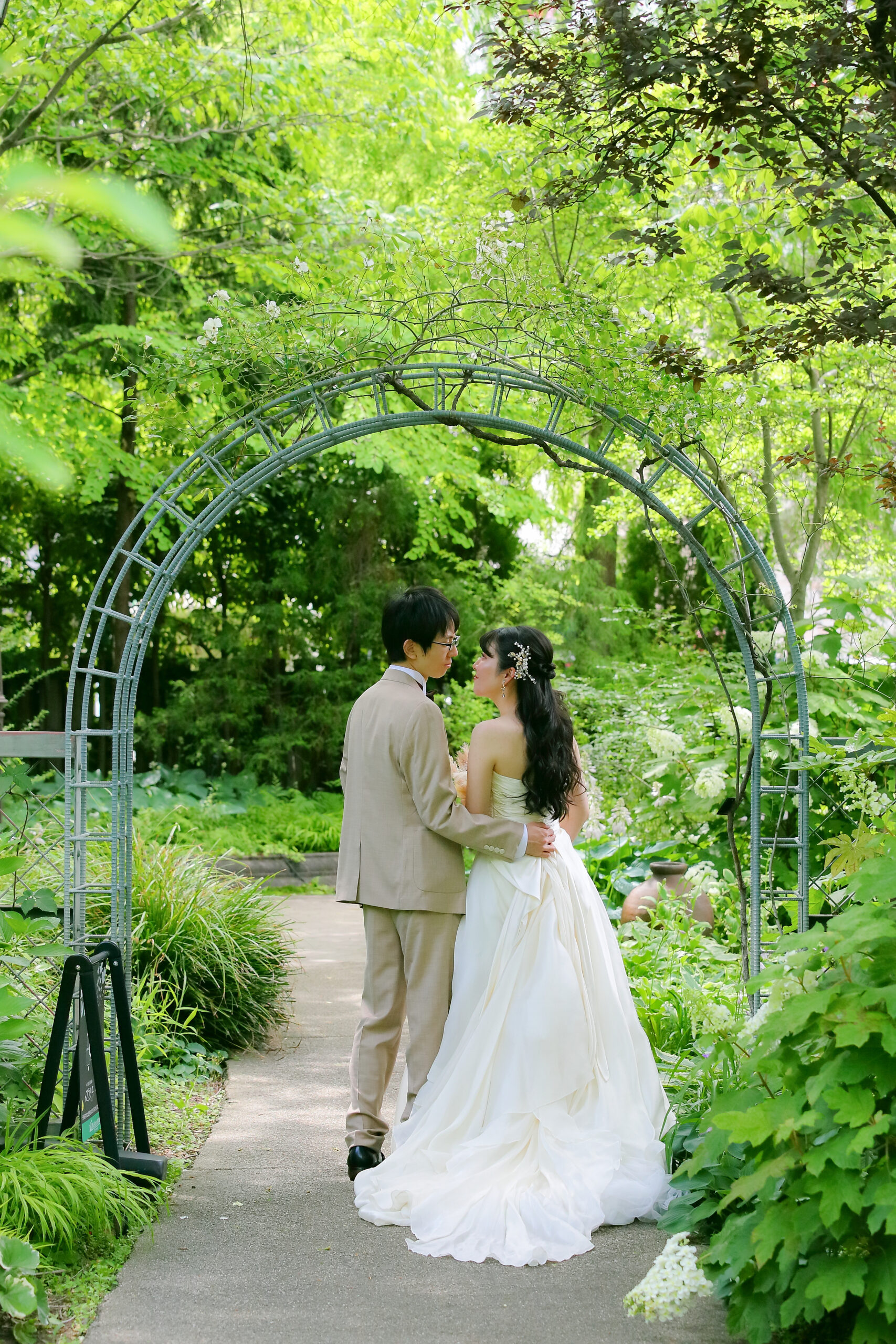 久屋大通庭園フラリエで洋装フォトウェディング 緑の中で見つめ合いショット 愛知でロケーションフォト