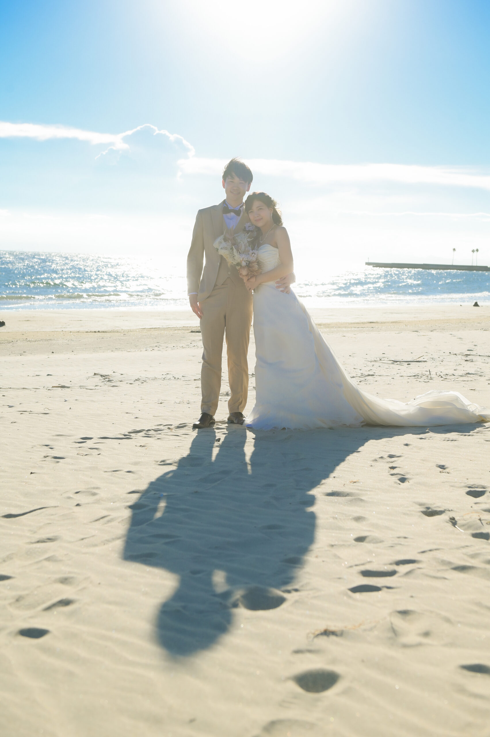 常滑りんくうビーチで洋装ウェディングフォト 海をバックに前撮り キラキラ光る太陽の下で撮影