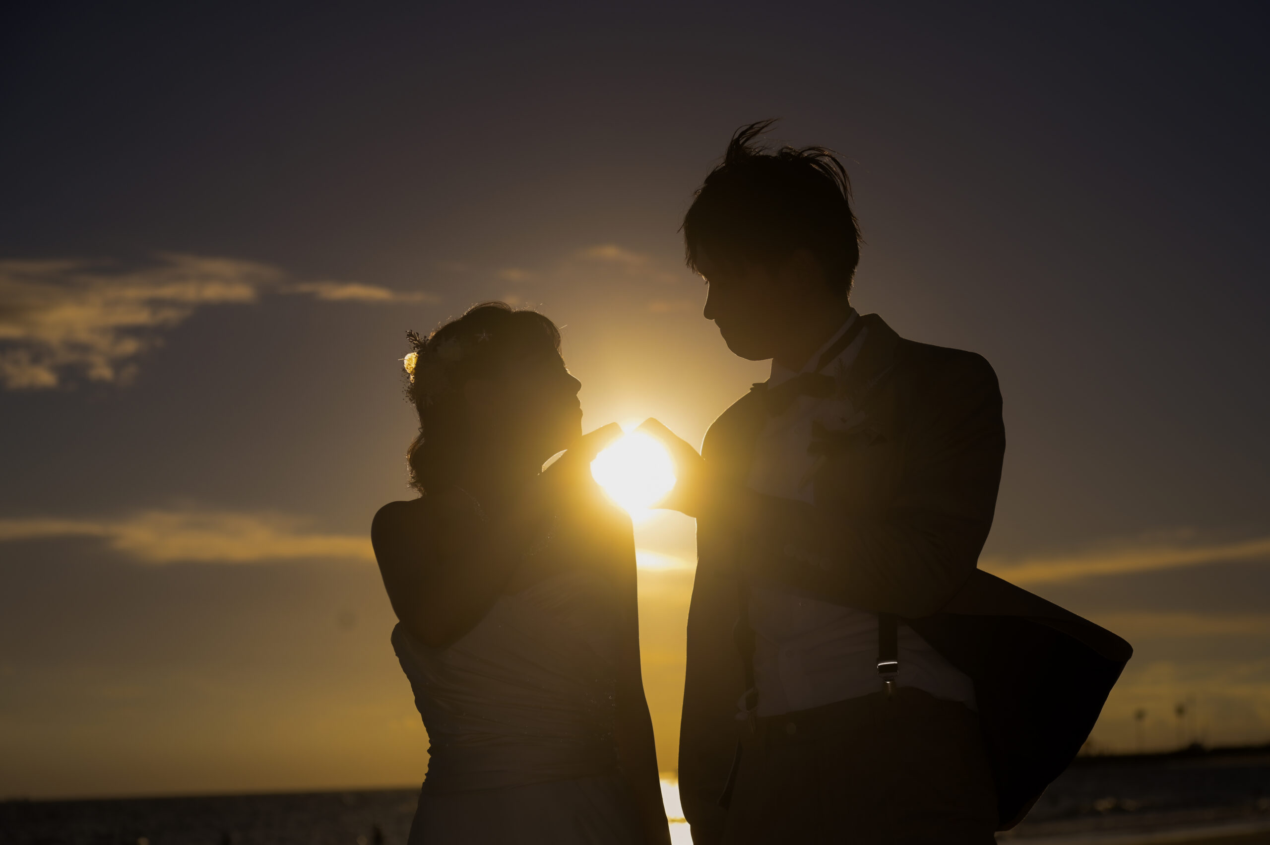 常滑りんくうビーチで洋装ウェディングフォト 夕日をバックにシルエットショット 見つめ合う新郎新婦 サンセットビーチ
