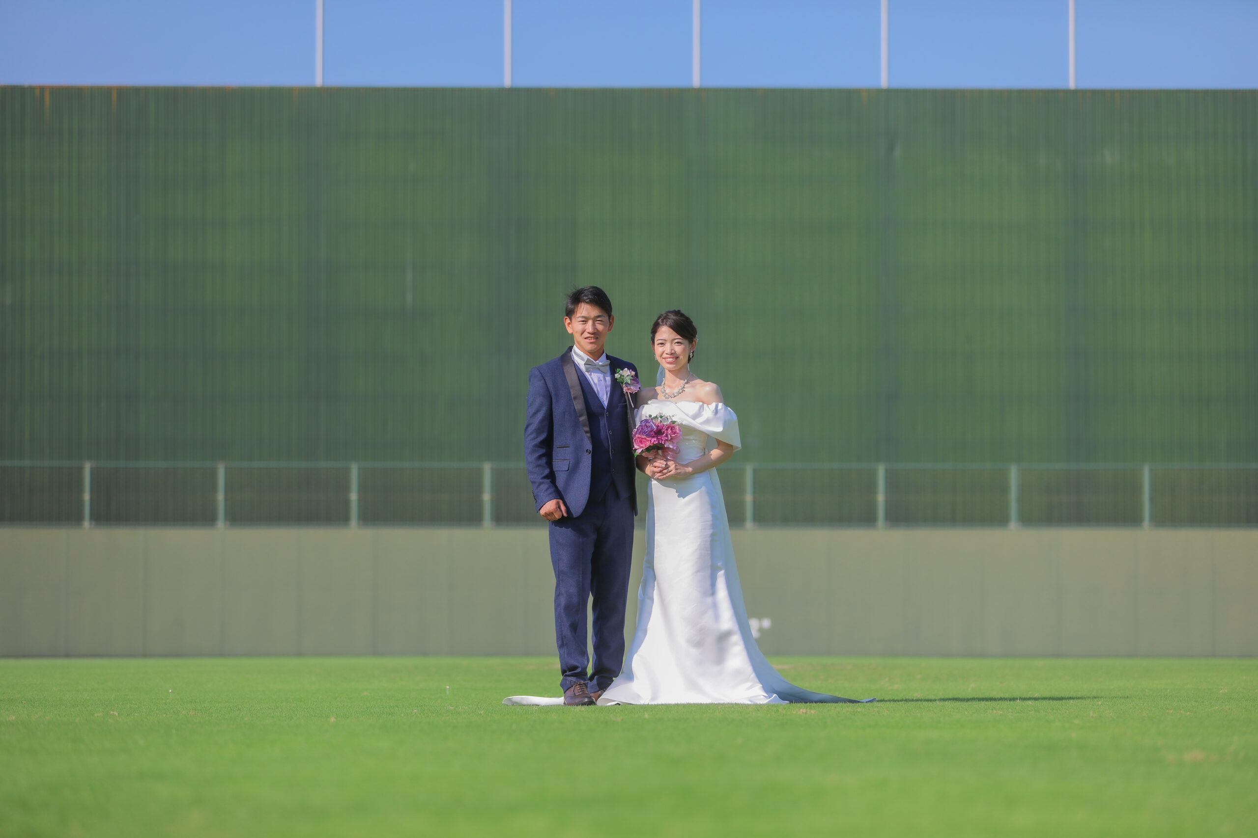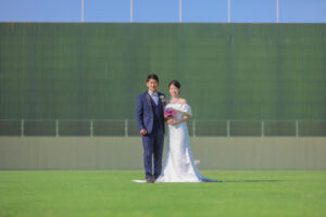 野球場で前撮り ブーケを手にもつ新婦 お好きなロケ地でウェディングフォト
