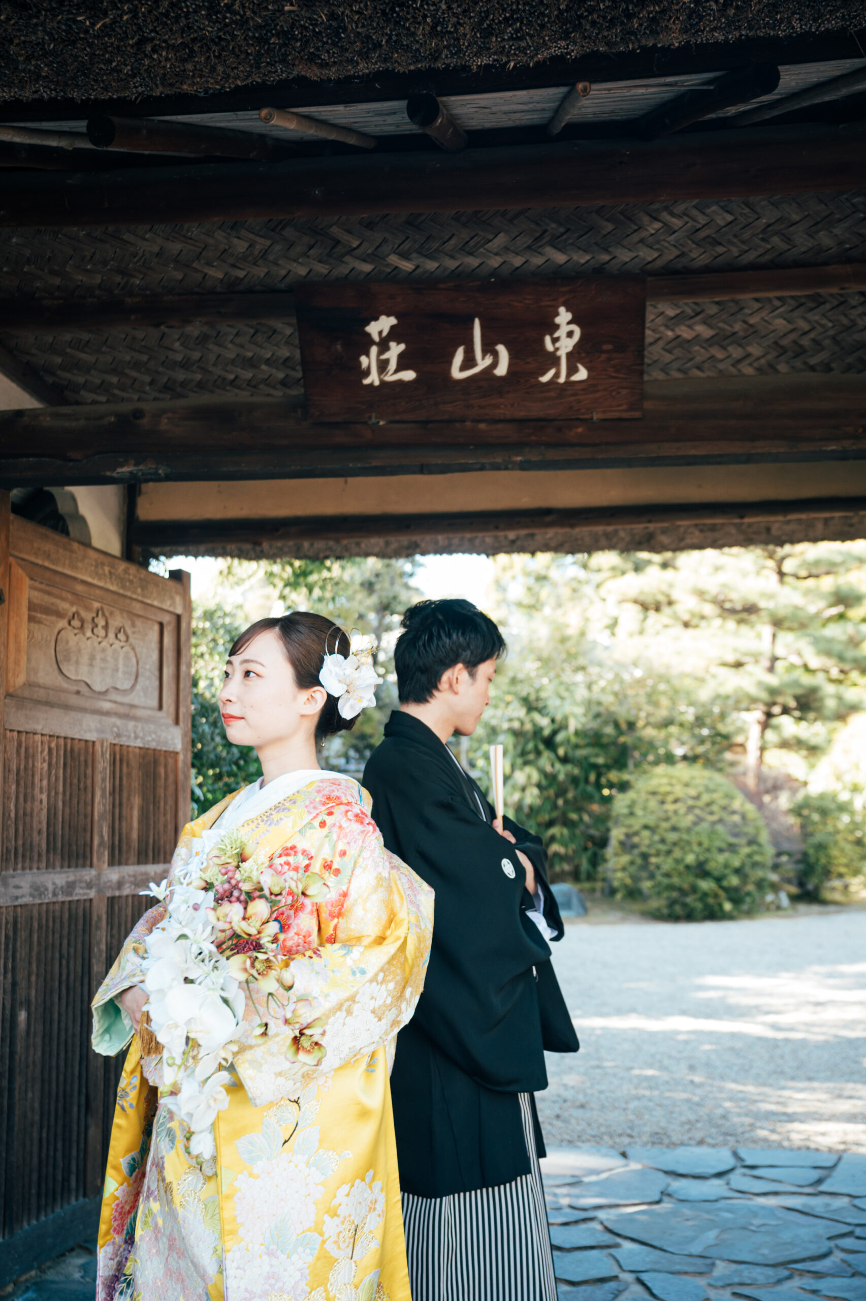 東山荘で和装前撮り 門の下で立つ