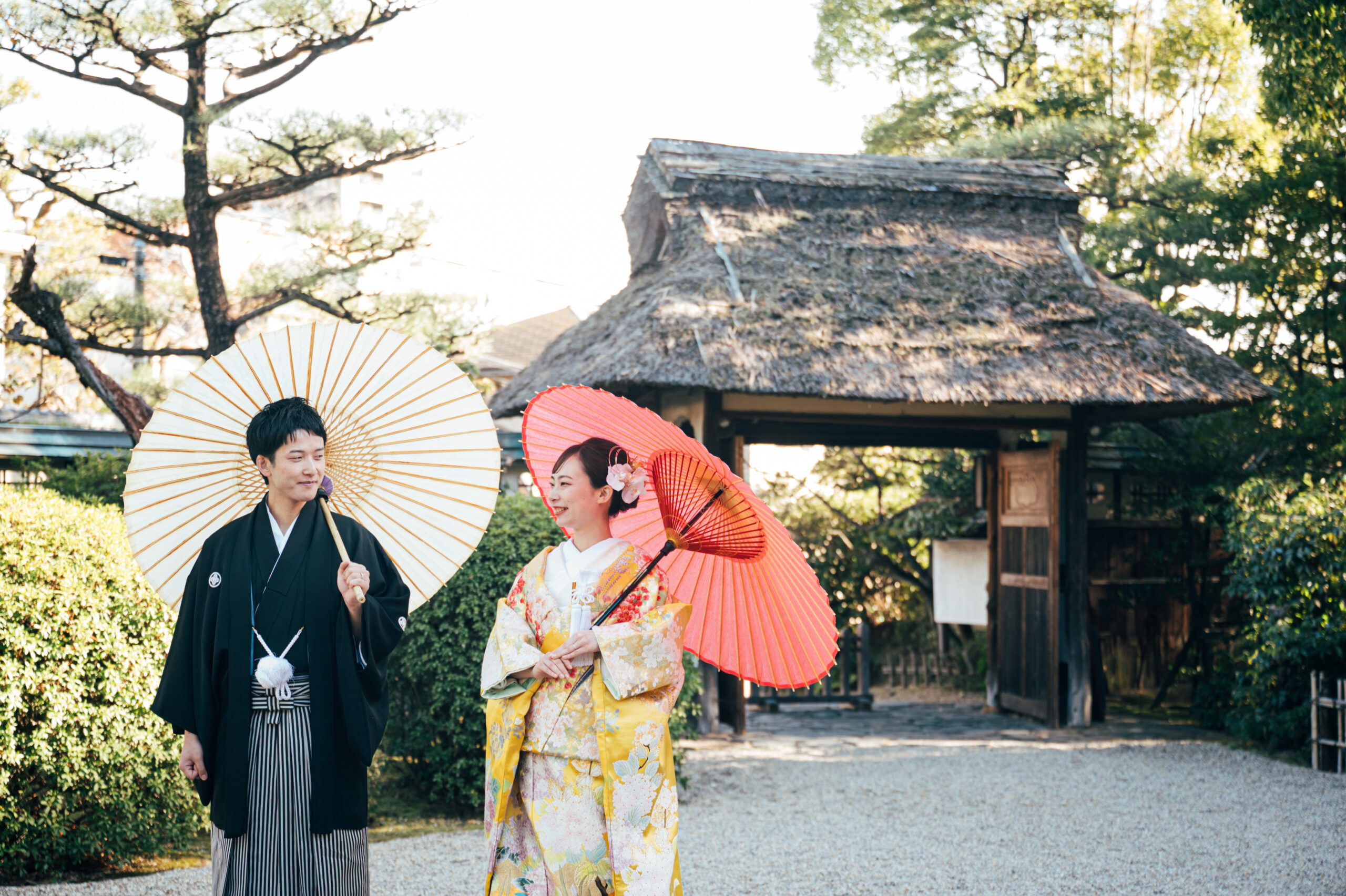 東山荘で和装ロケーションウェディングフォト和傘をさしてふたりでおしゃべり