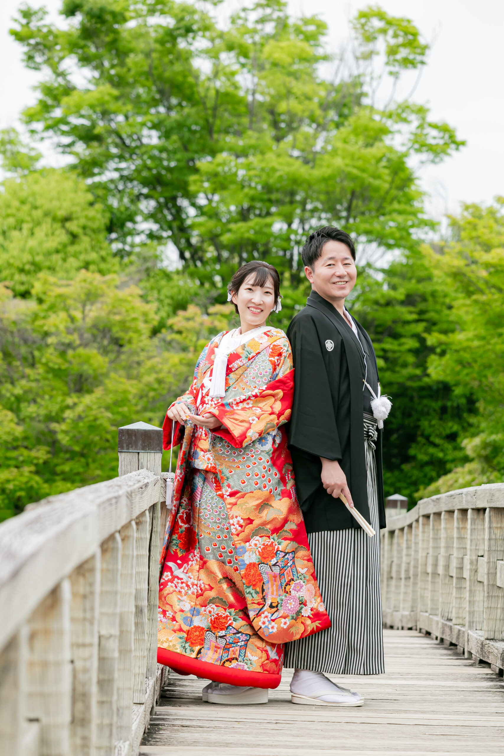 白鳥庭園で白無垢前撮り綿帽子 橋の上で背中合わせ
