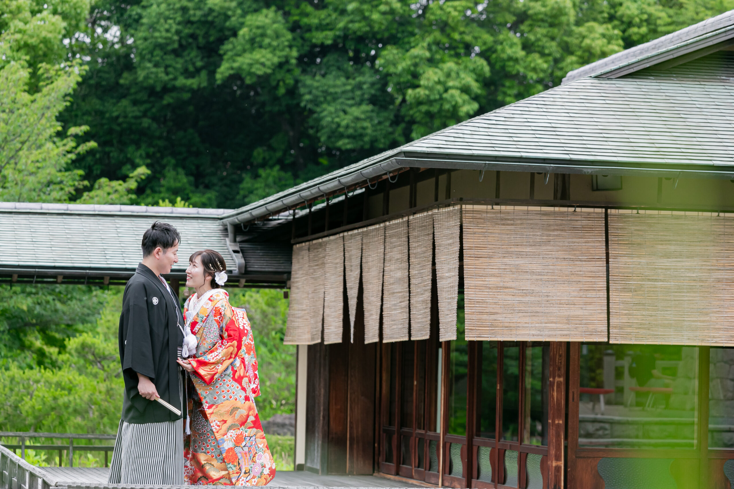 白鳥庭園で和装ロケーションウェディングフォト 寄り添う