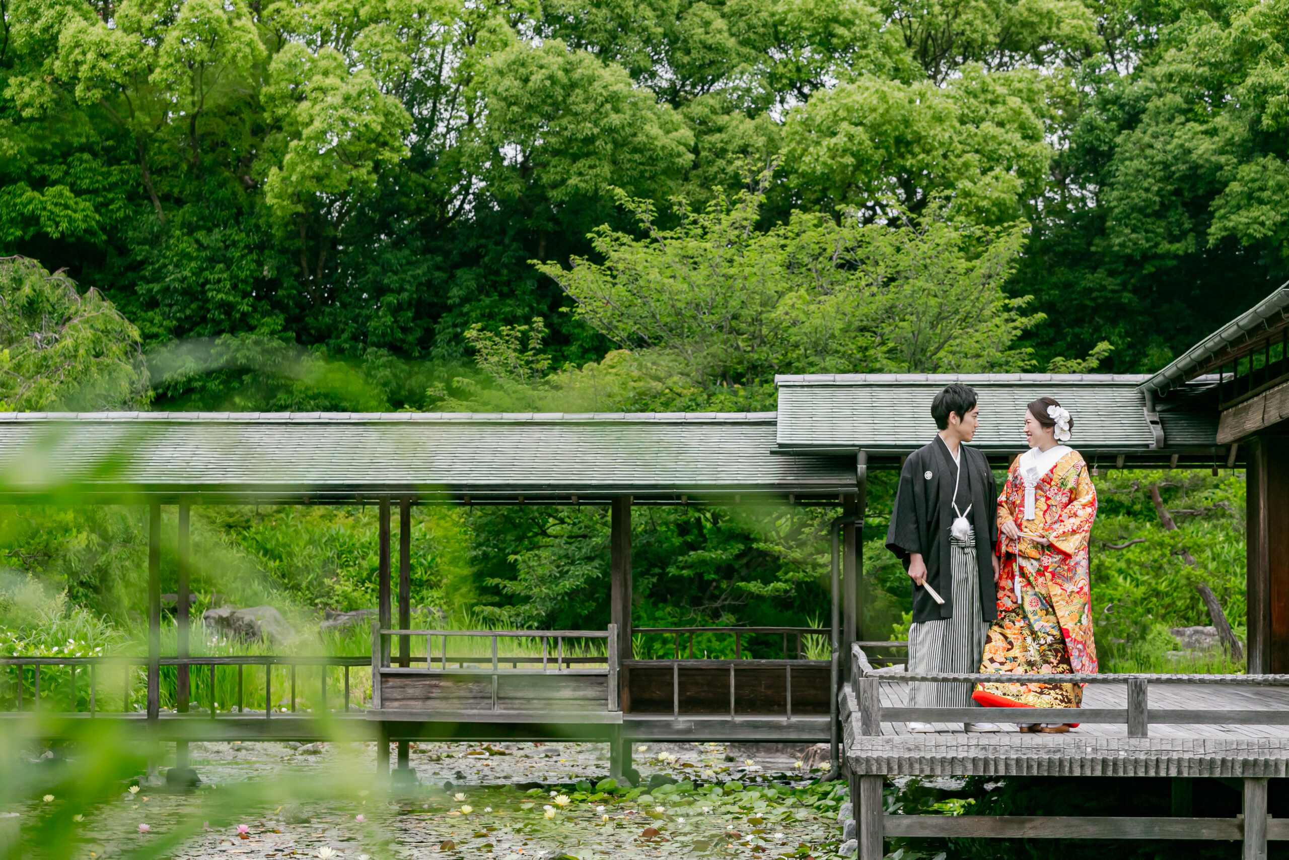 白鳥庭園で前撮りロケーション見つめ合うふたりを遠くから