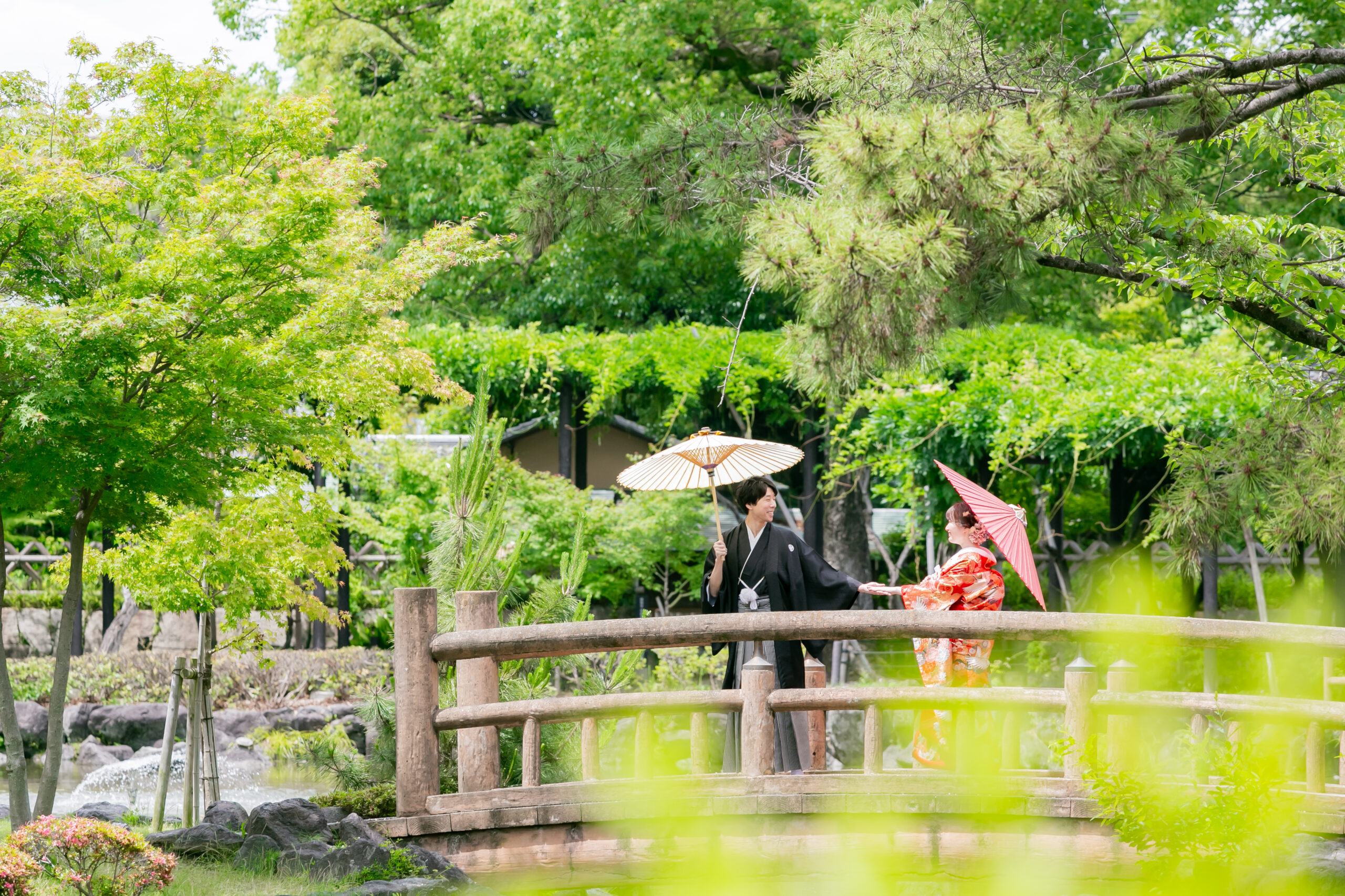 名古屋の中村公園で和装ロケーション 新婦をエスコートする新郎