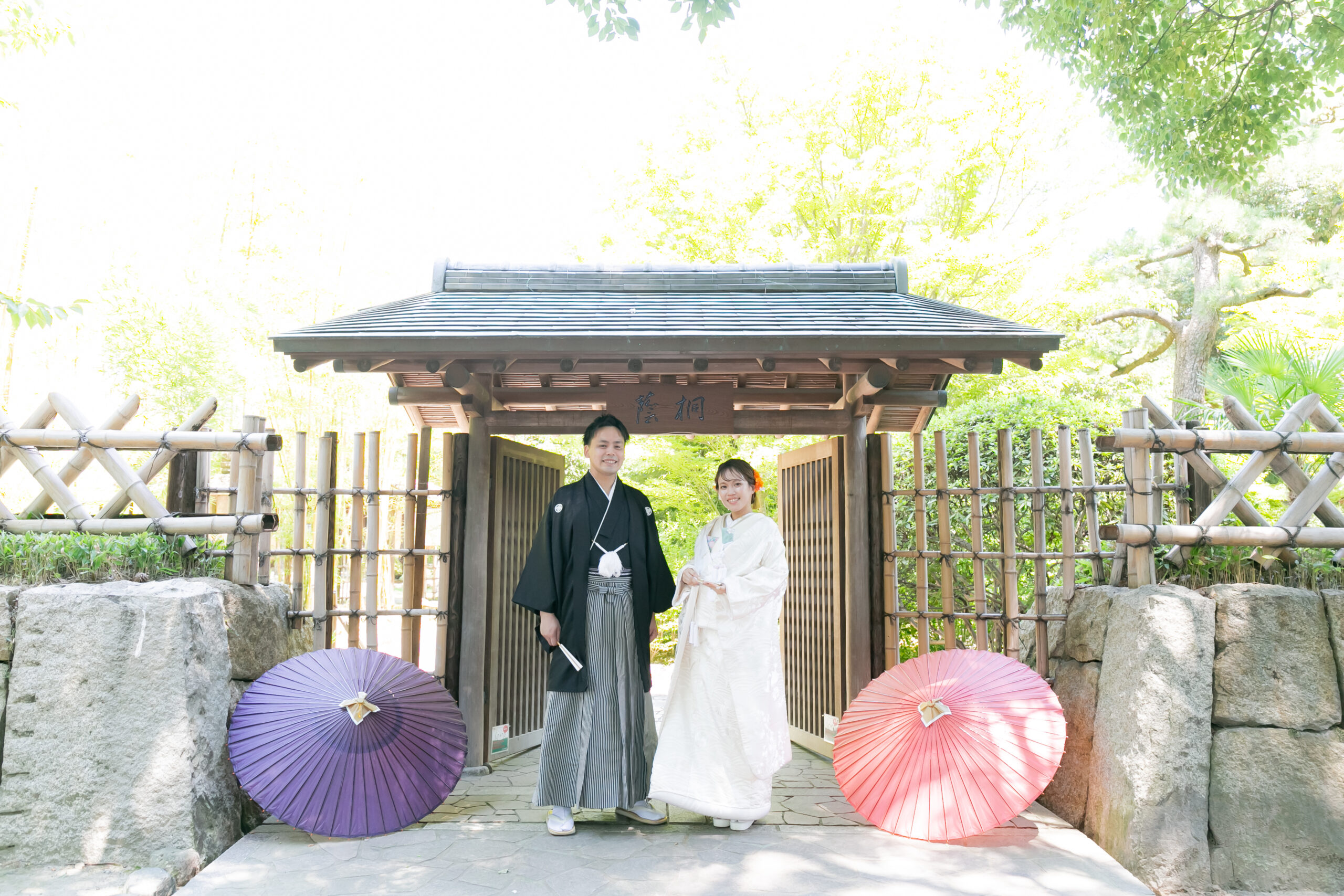 中村公園桐蔭茶席で和装ロケーション前撮り 門の前で
