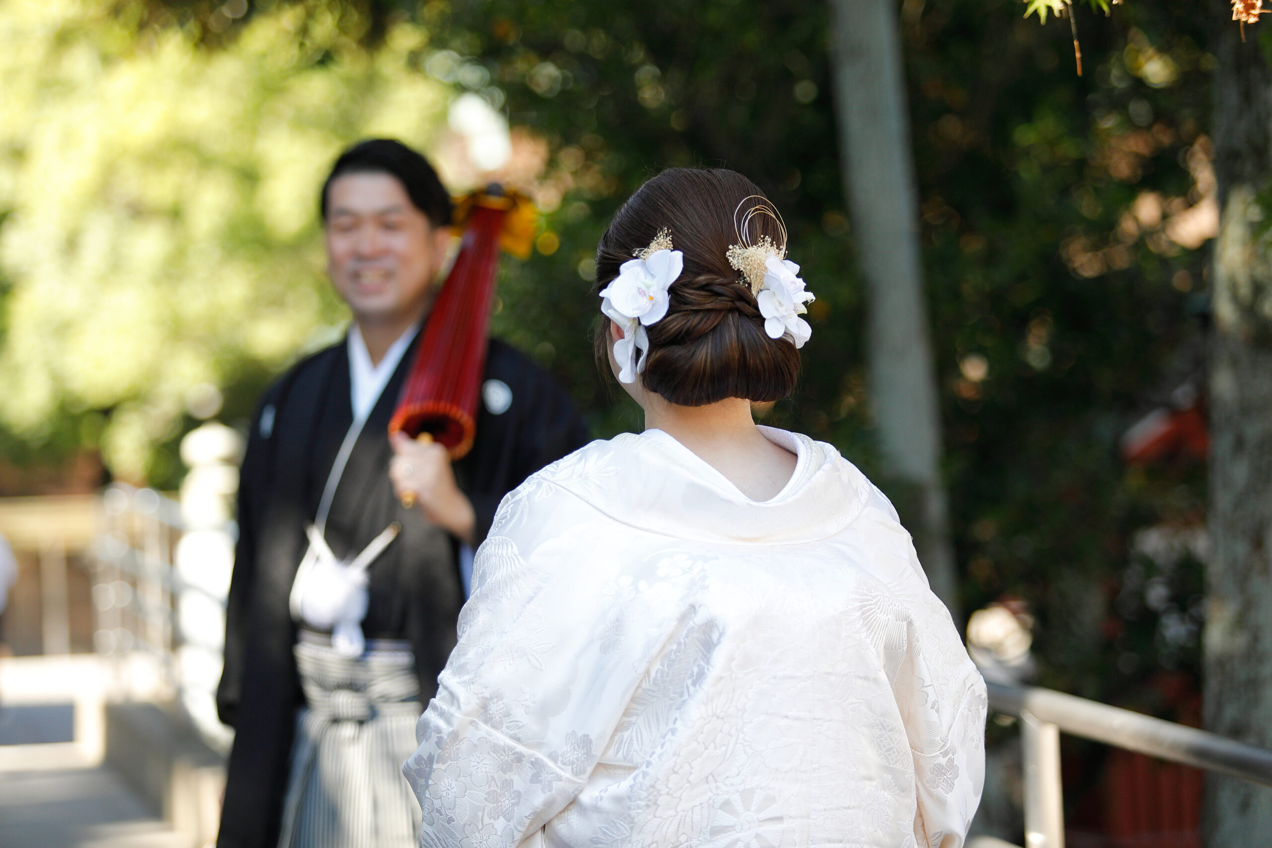津島神社で和装ウェディングフォト 花嫁を見つめる花婿