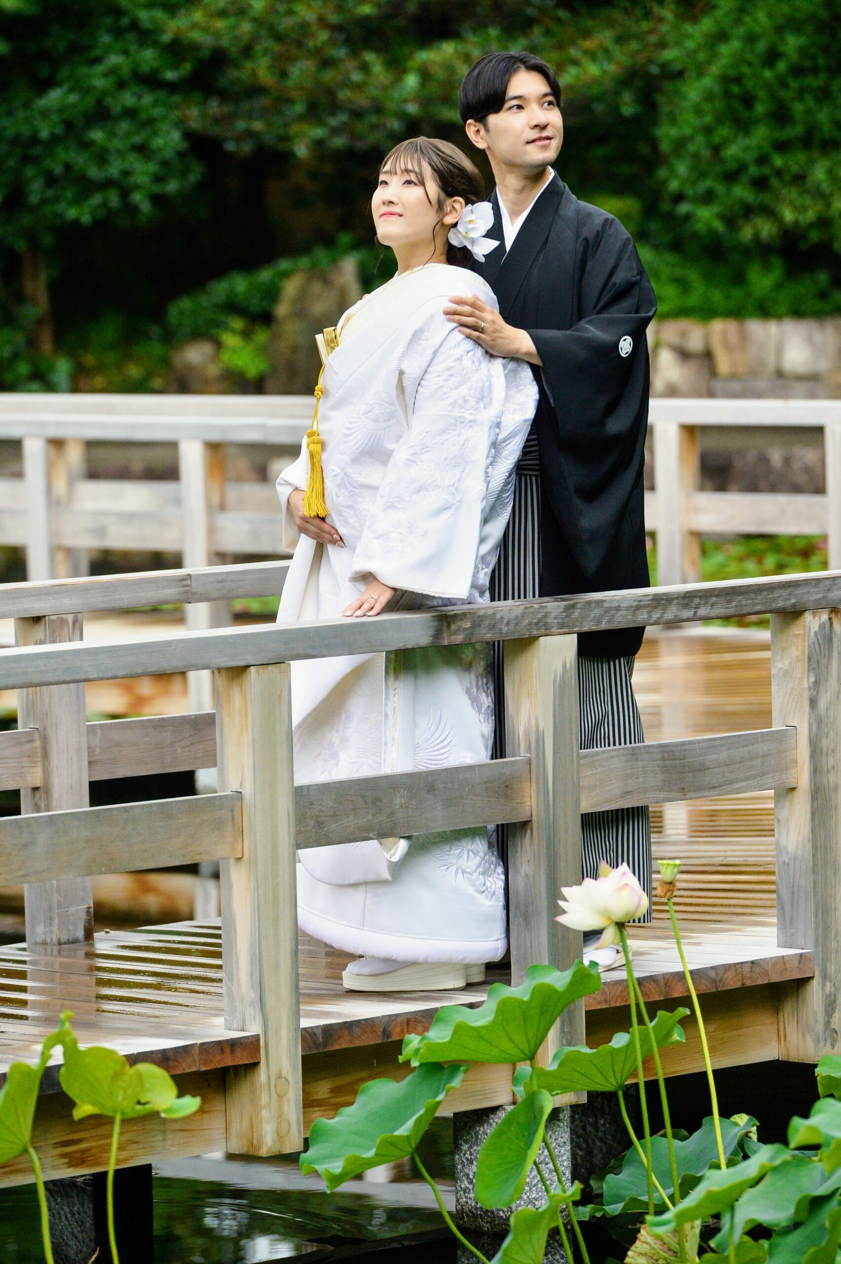 徳川園で白無垢ロケーション前撮り 木の橋の上で寄り添うふたり