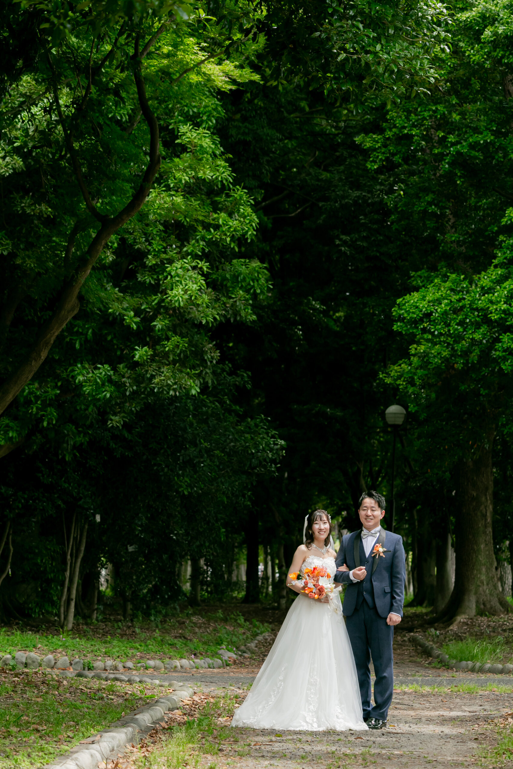 庄内緑地でウェディングドレスとタキシードで前撮り 濃い緑を背景に