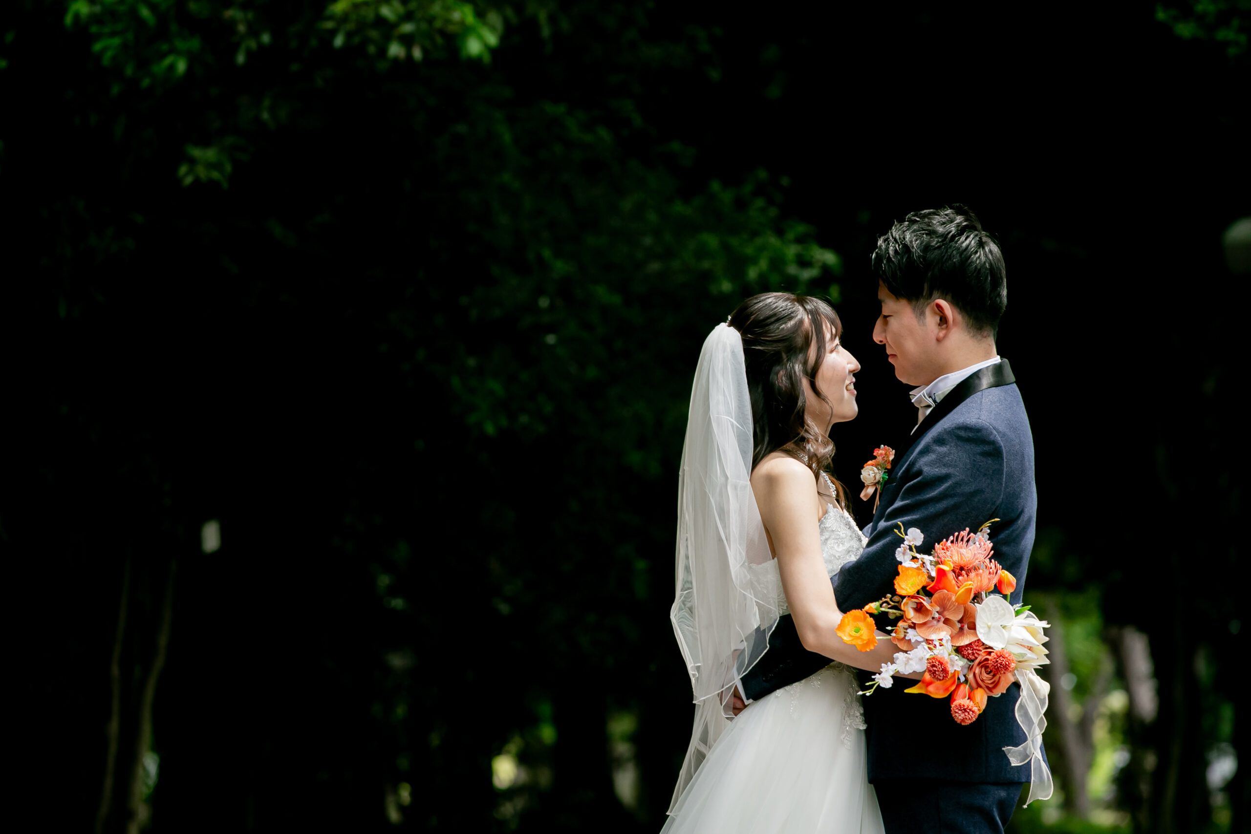 庄内緑地でウェディングドレスとタキシードで前撮り 濃い緑を背景に