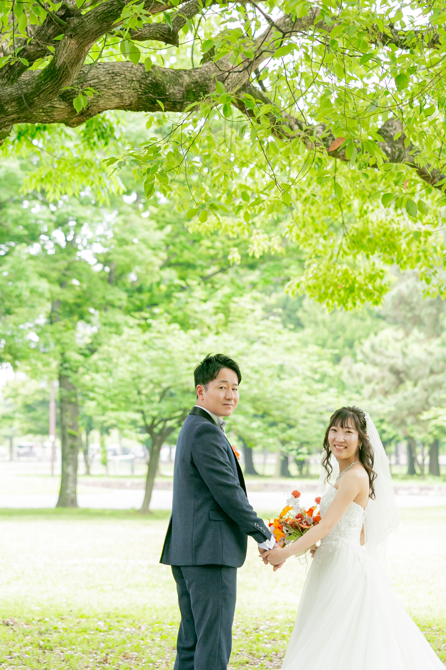 庄内緑地で洋装ウェディングフォト 振り返る