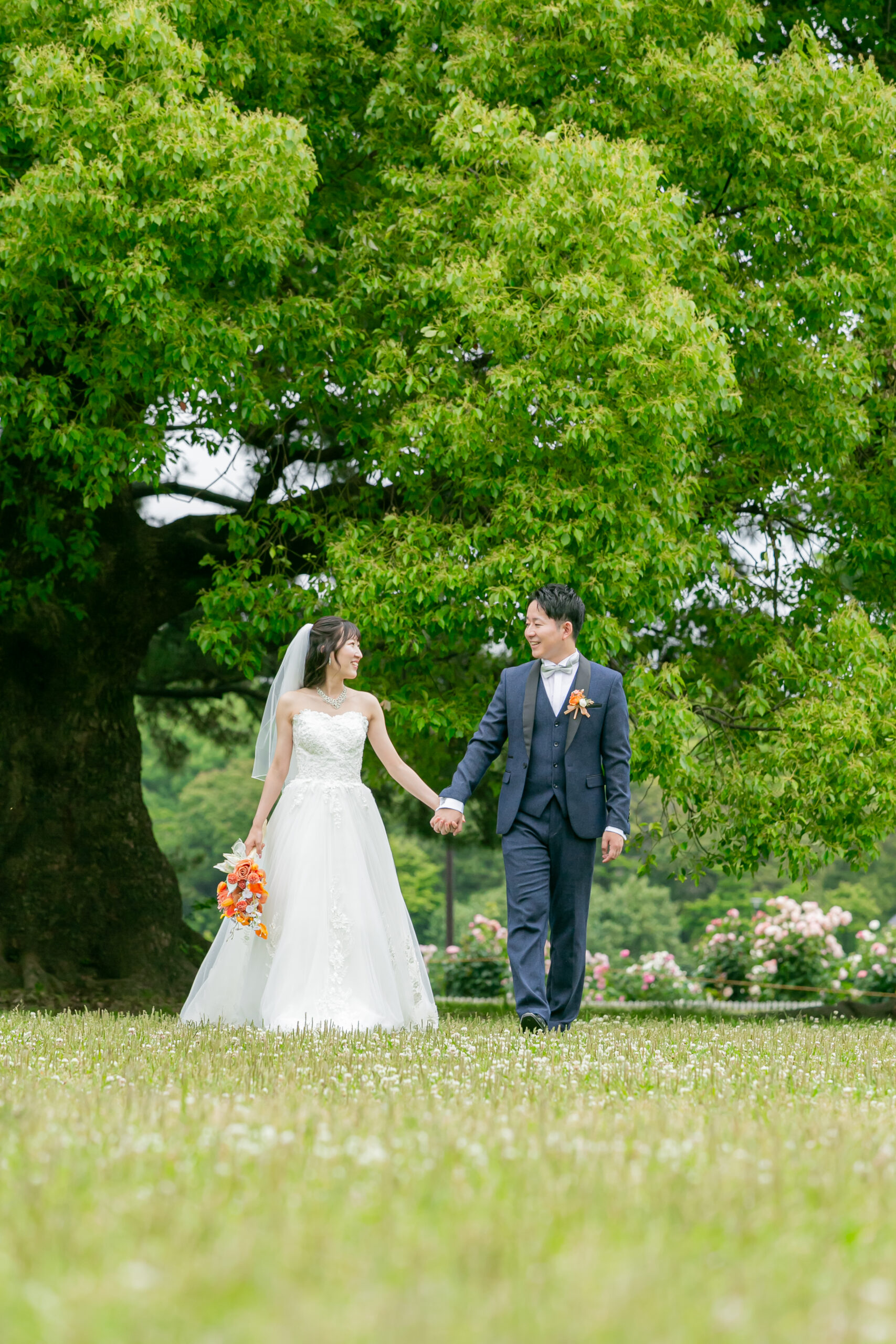 庄内緑地で洋装ウェディングフォト 緑の中を手をつないで歩く