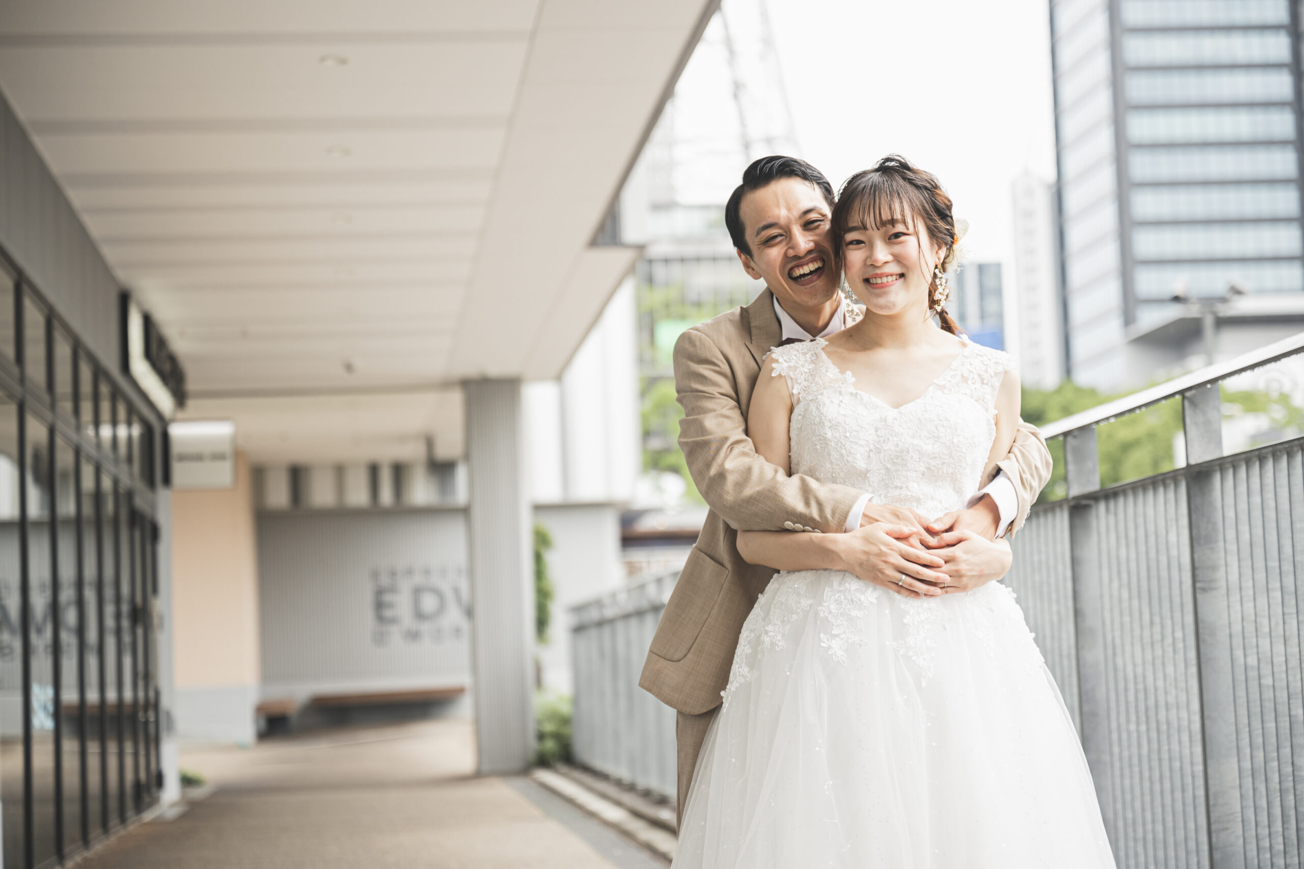 久屋大通パークでロケーション前撮り 花嫁を優しくハグする花婿 名古屋でウェディングフォト