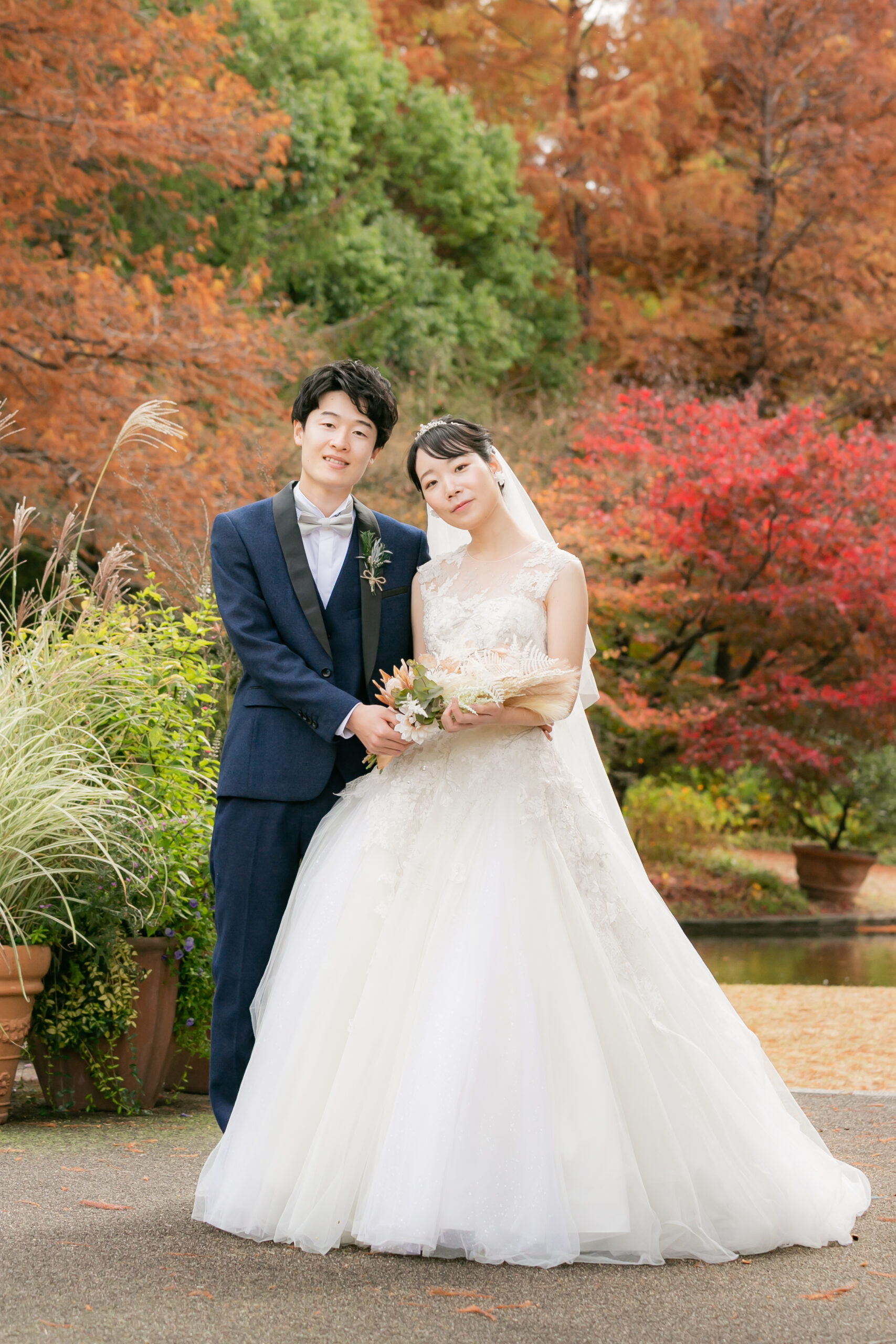 久屋大通庭園フラリエで洋装ロケーション前撮り ブーケを持つ新郎新婦 名古屋で紅葉前撮り
