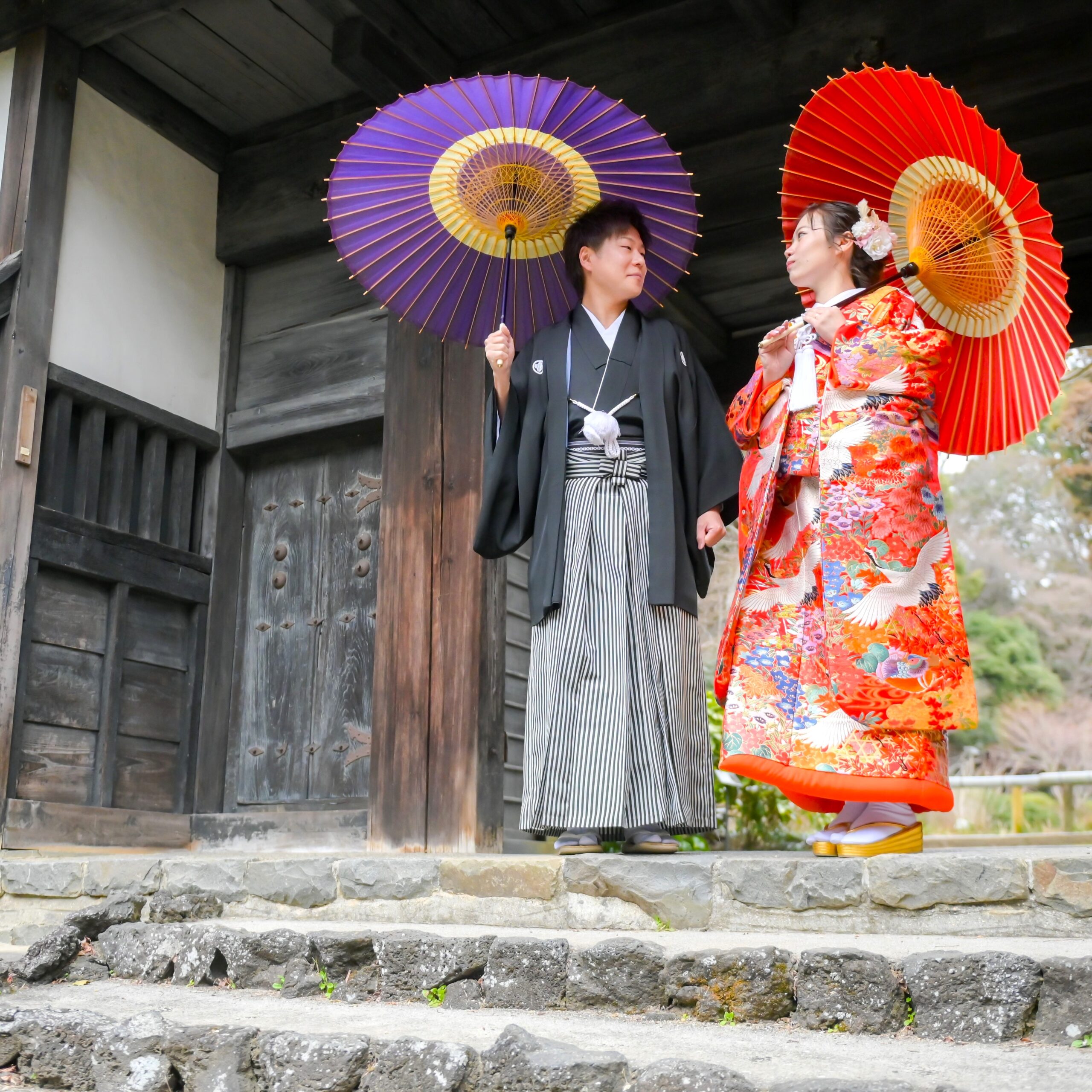 東山植物園内の宗節庵で和装ロケーション前撮り 和傘をさして見つめ合う新郎新婦 色打掛前撮り