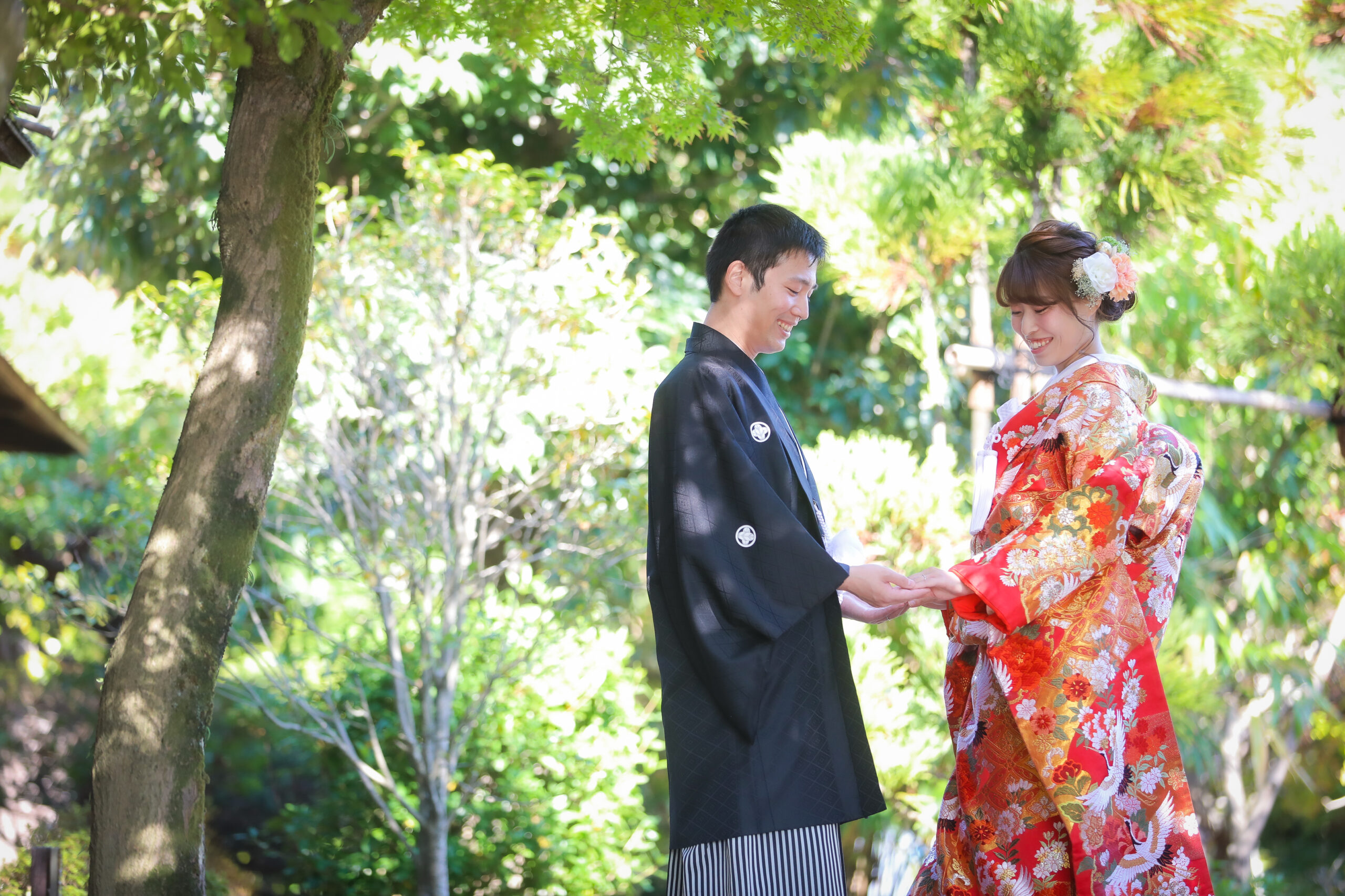 東山荘で和装ロケーション前撮り 手を重ねる新郎新婦 名古屋で和装ウェディングフォト