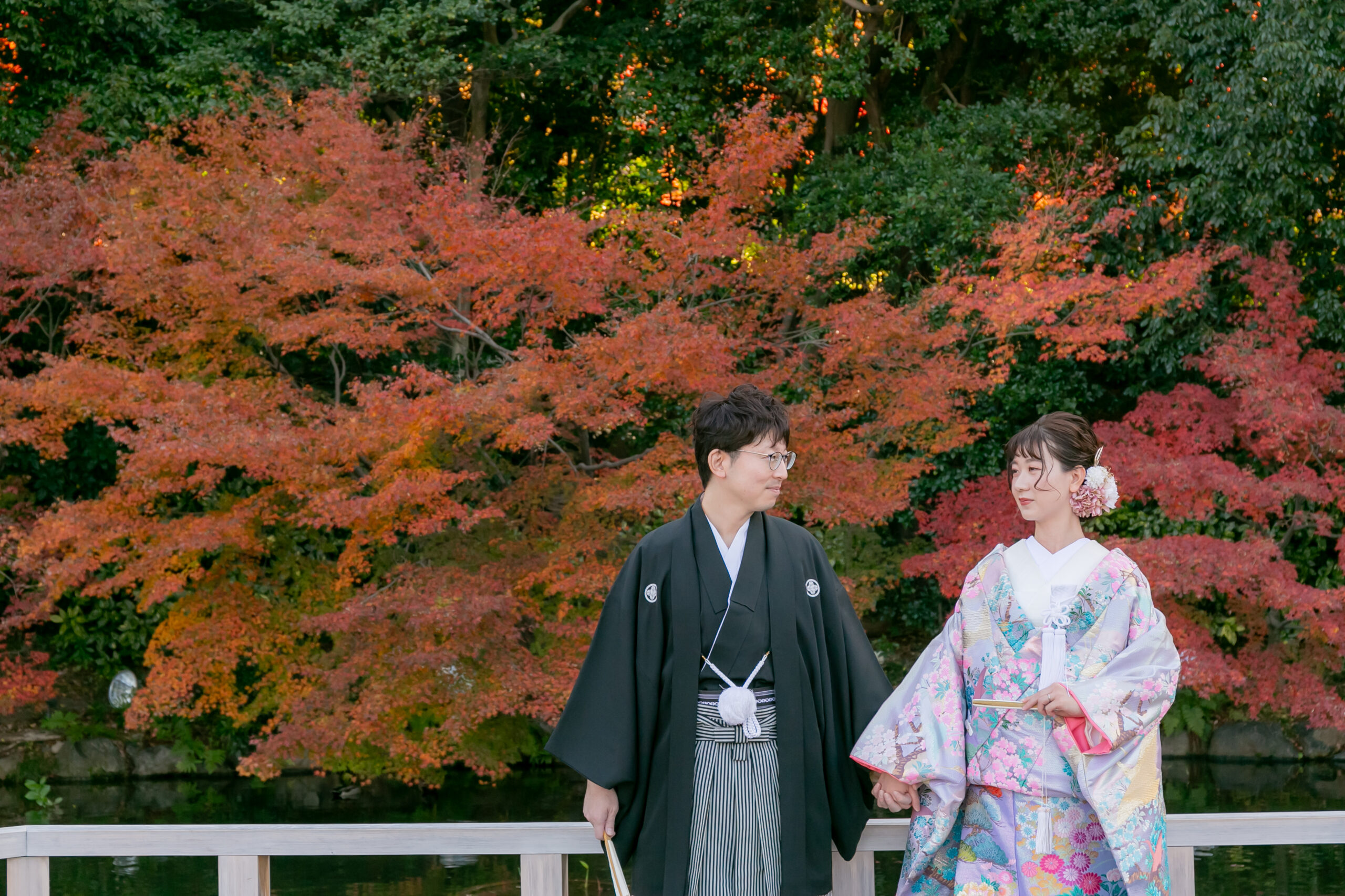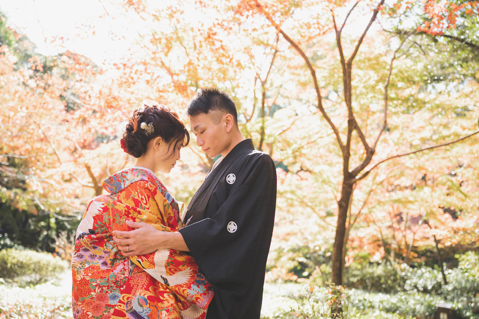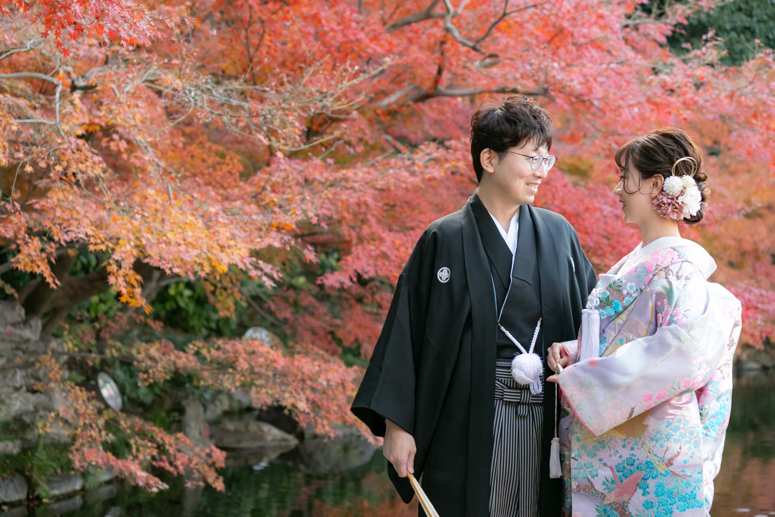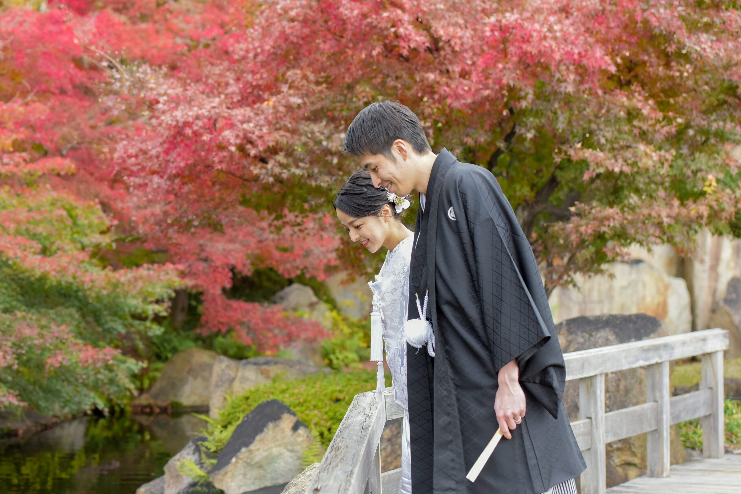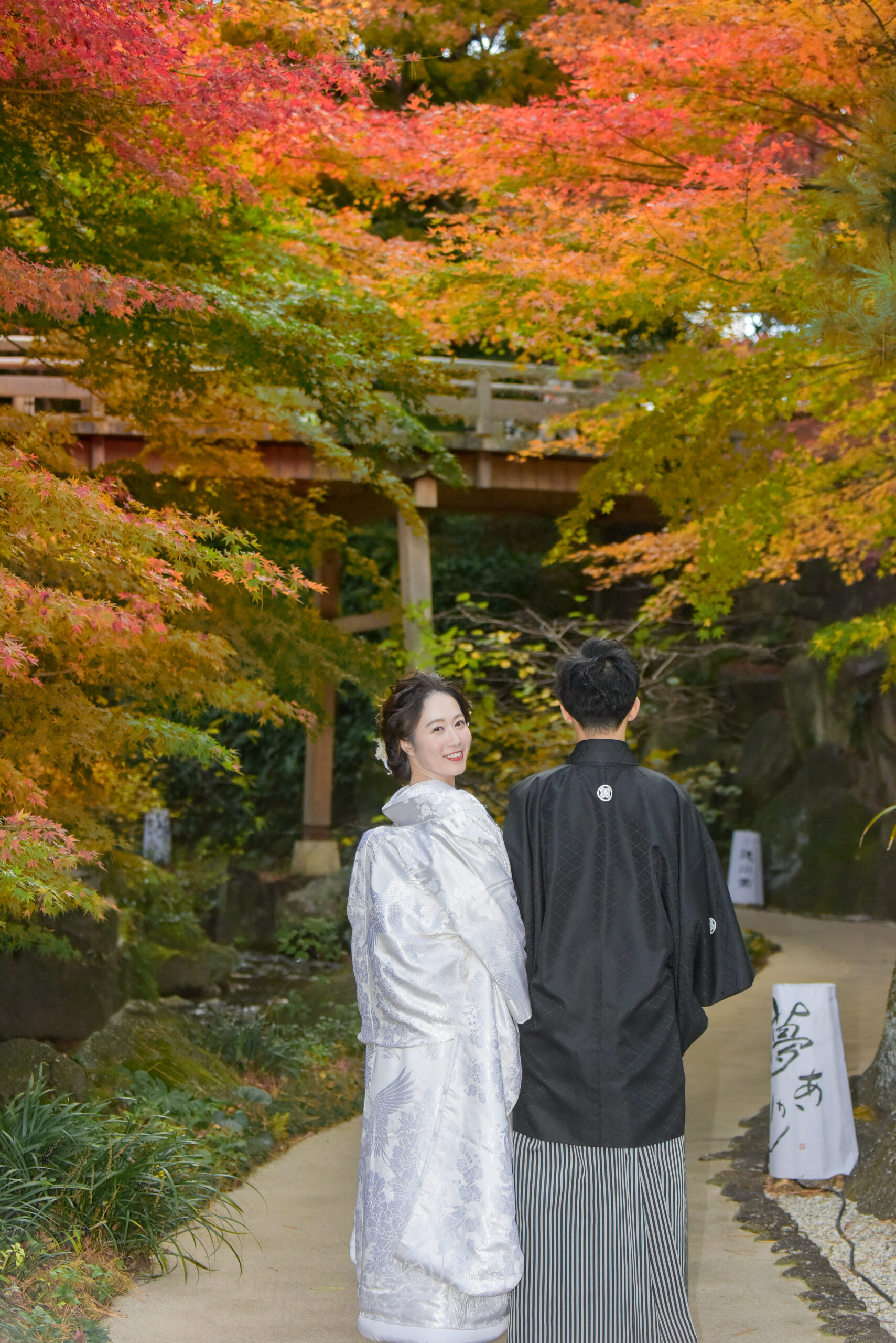 徳川園で和装ウェディングフォト 紅葉と新郎新婦 名古屋の人気ロケ地