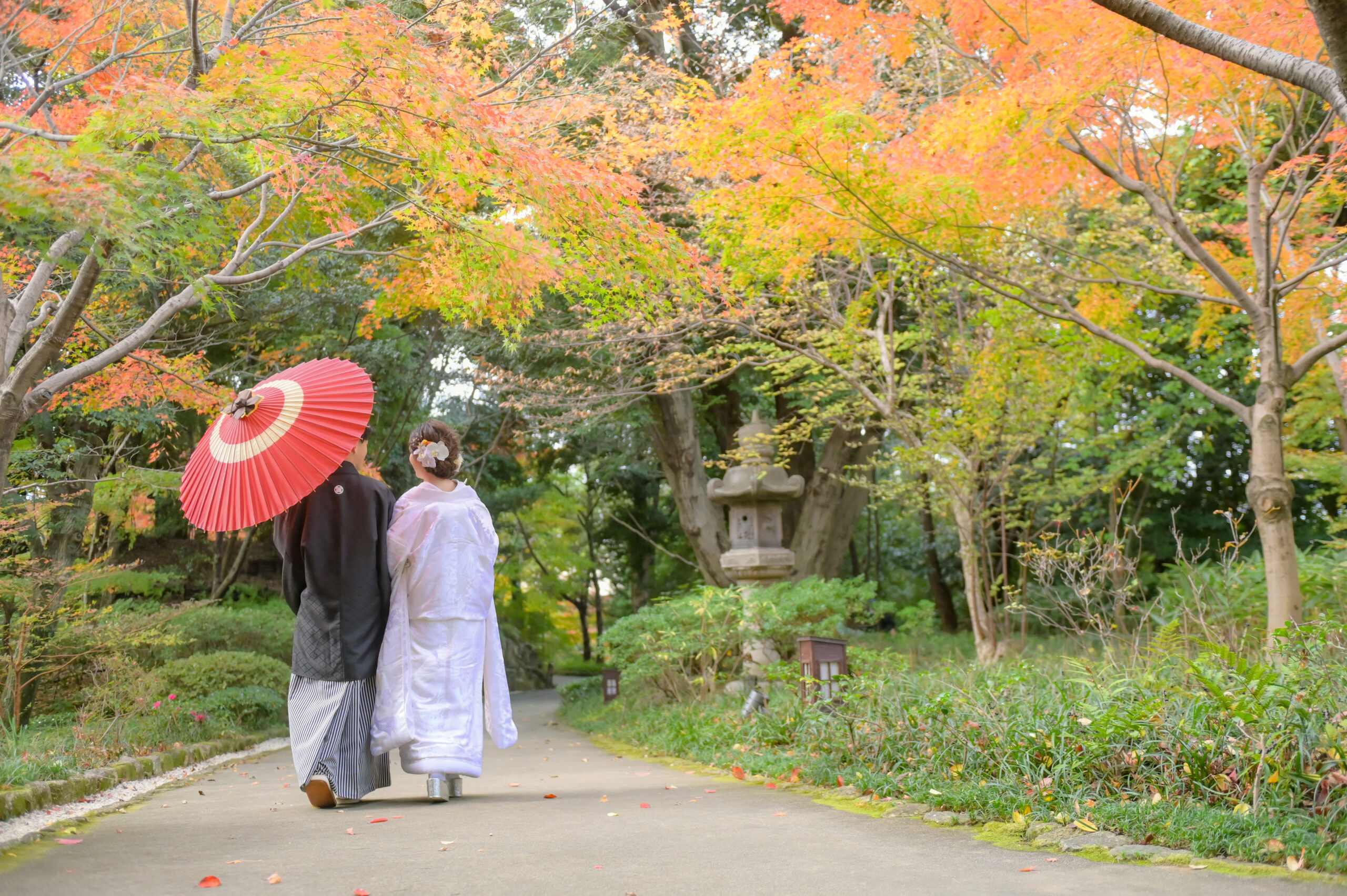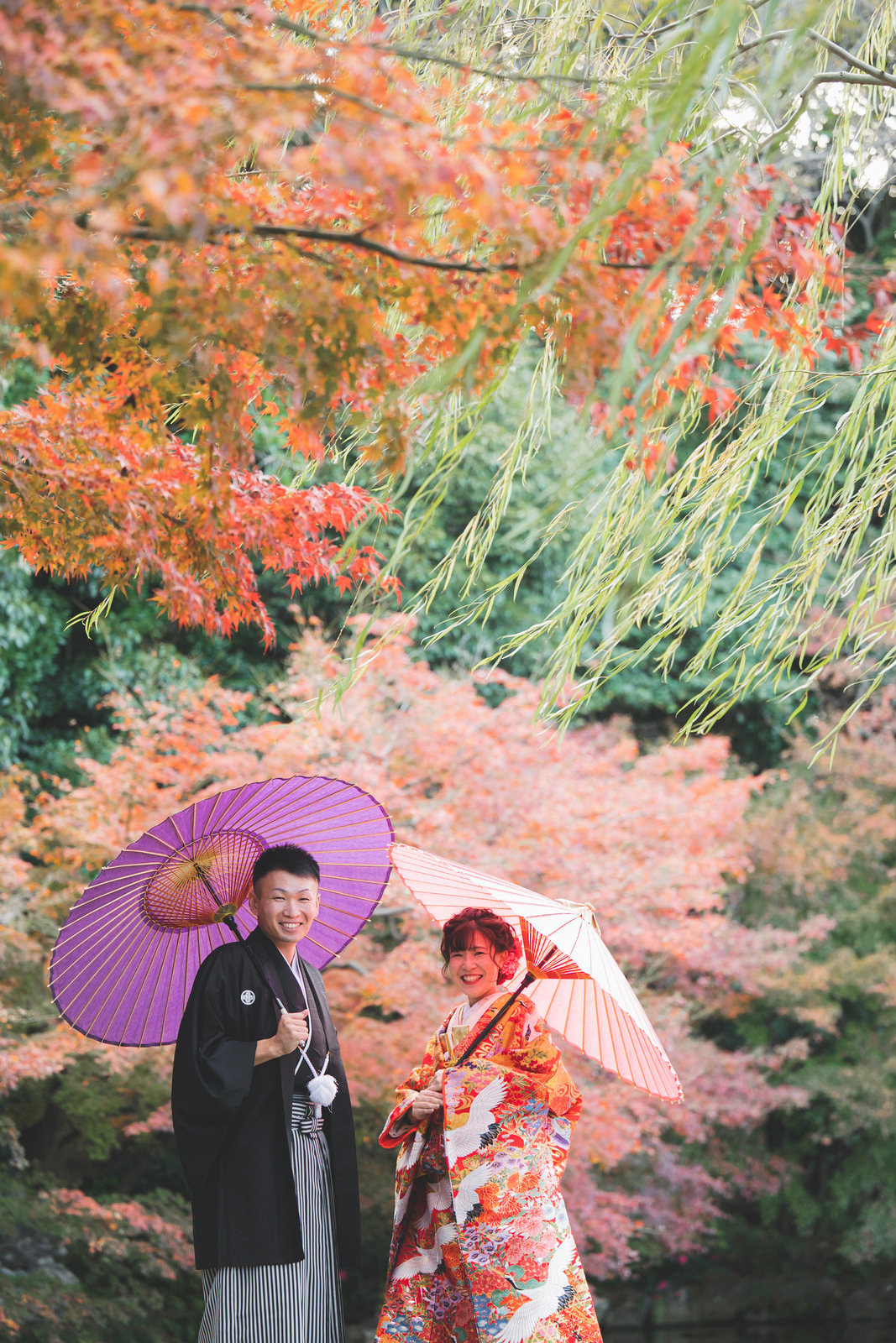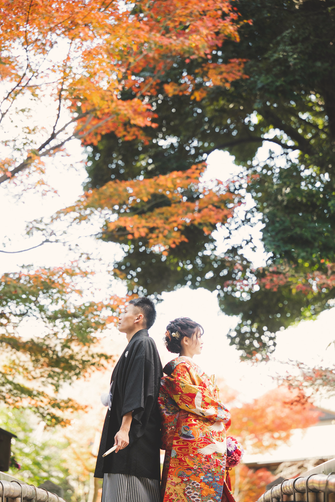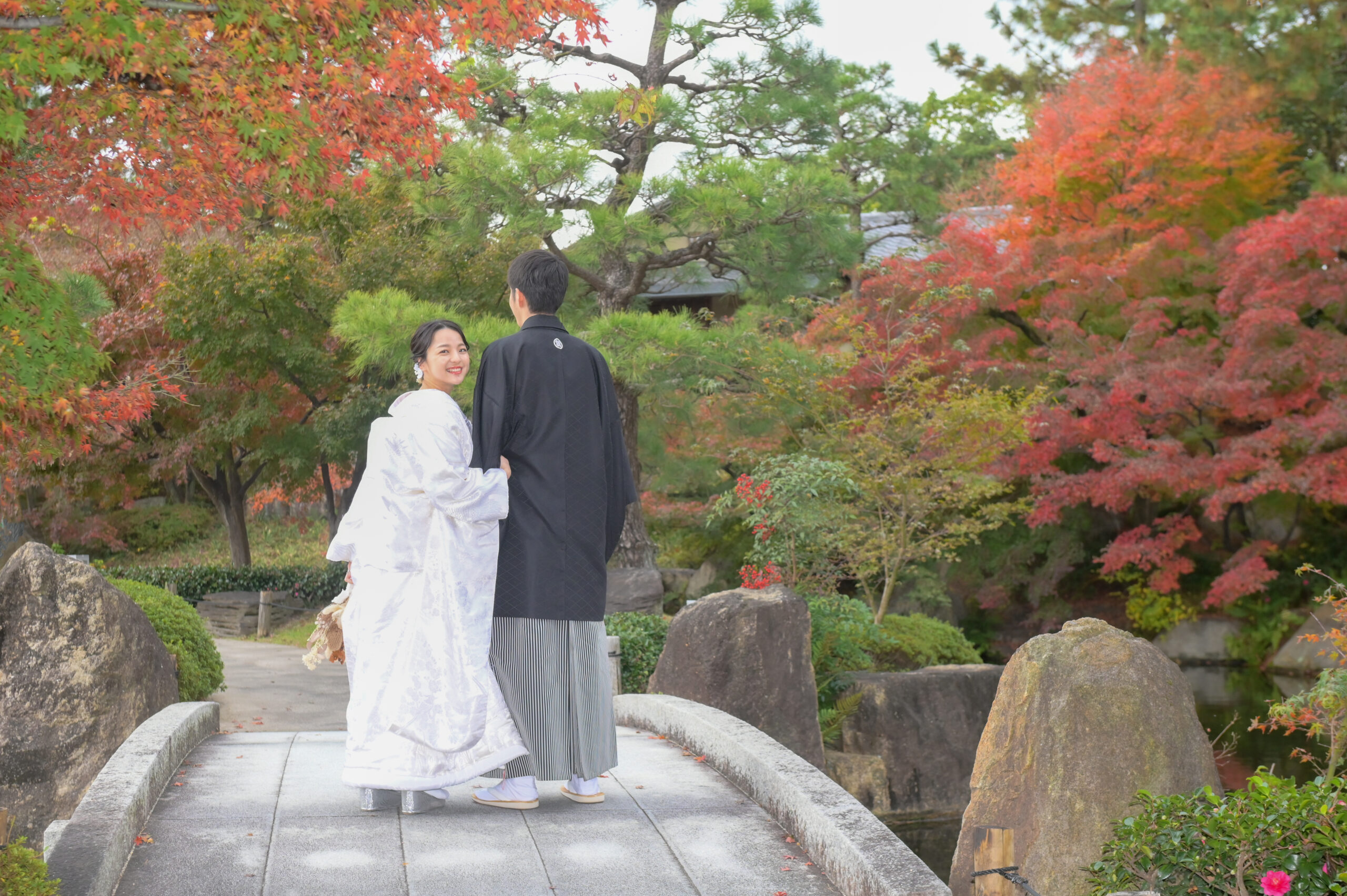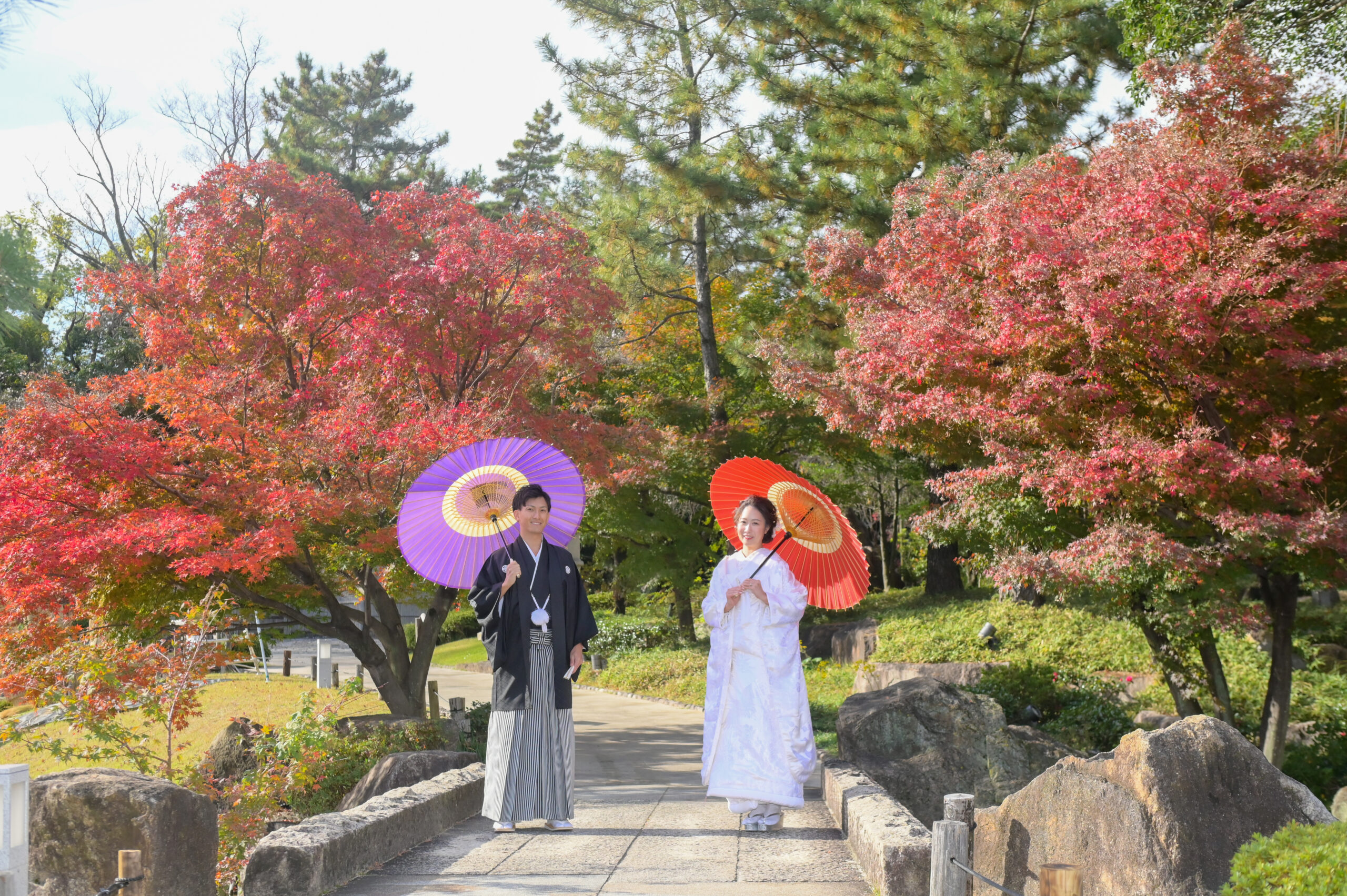 徳川園で和装ウェディングフォト 紅葉と新郎新婦 名古屋の人気ロケ地