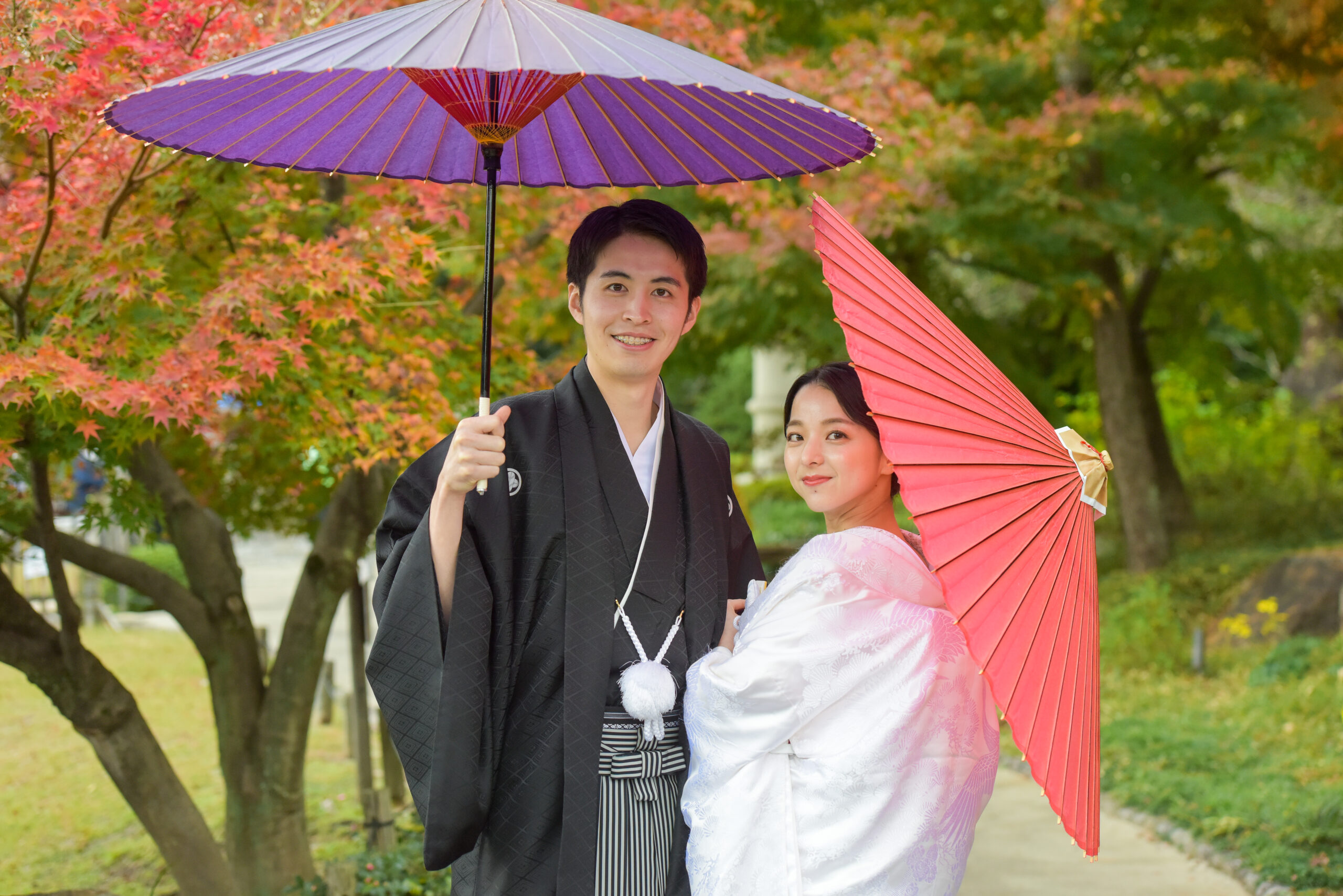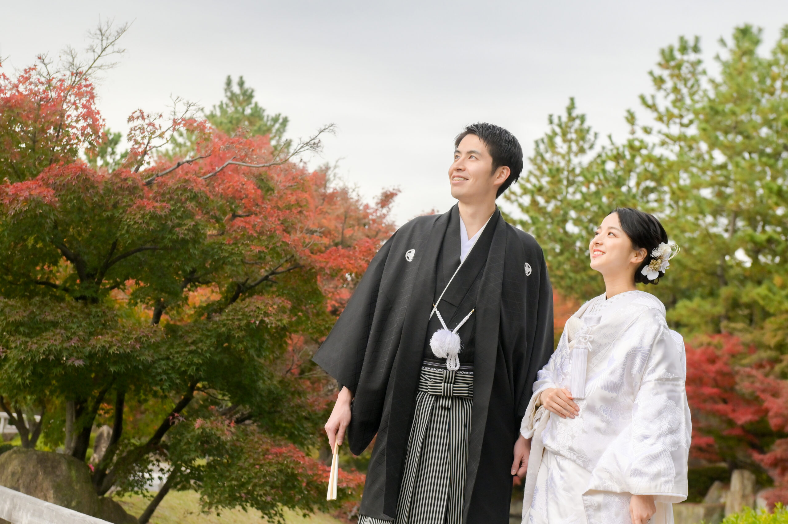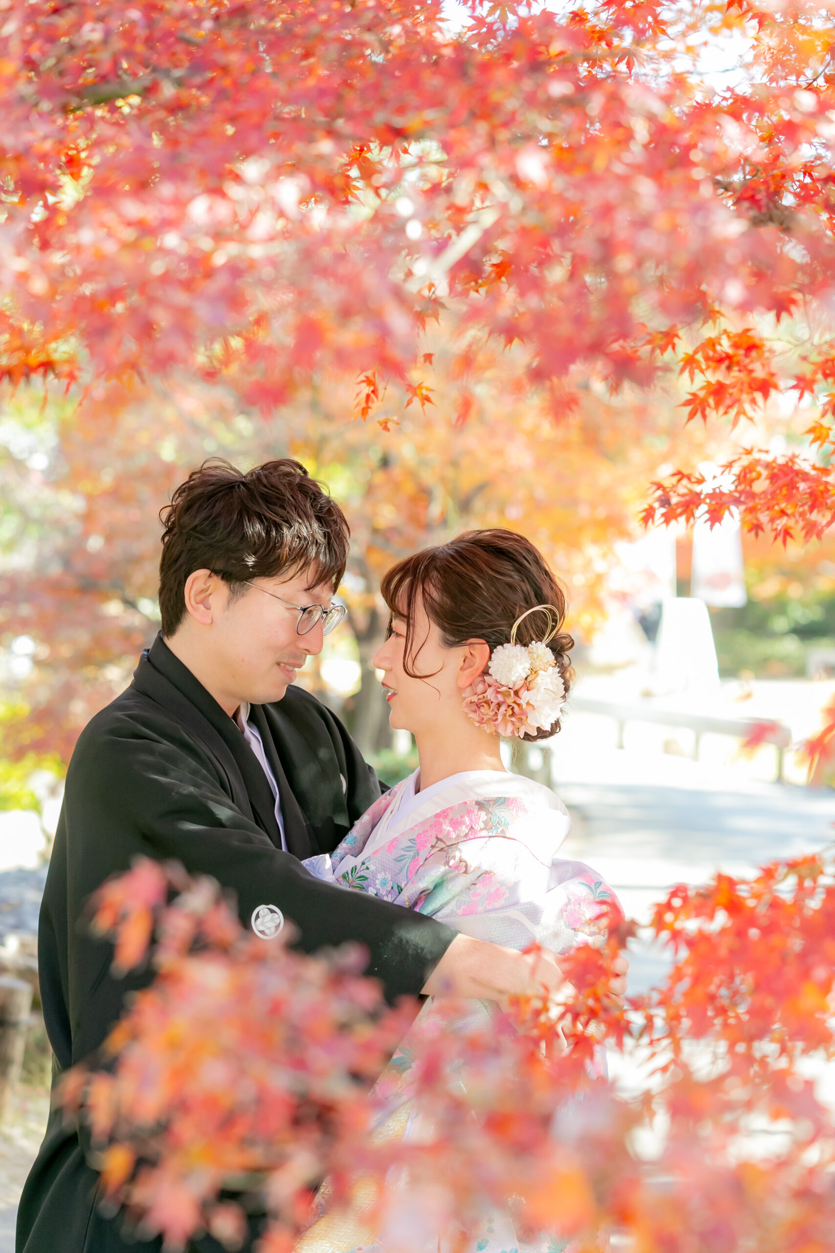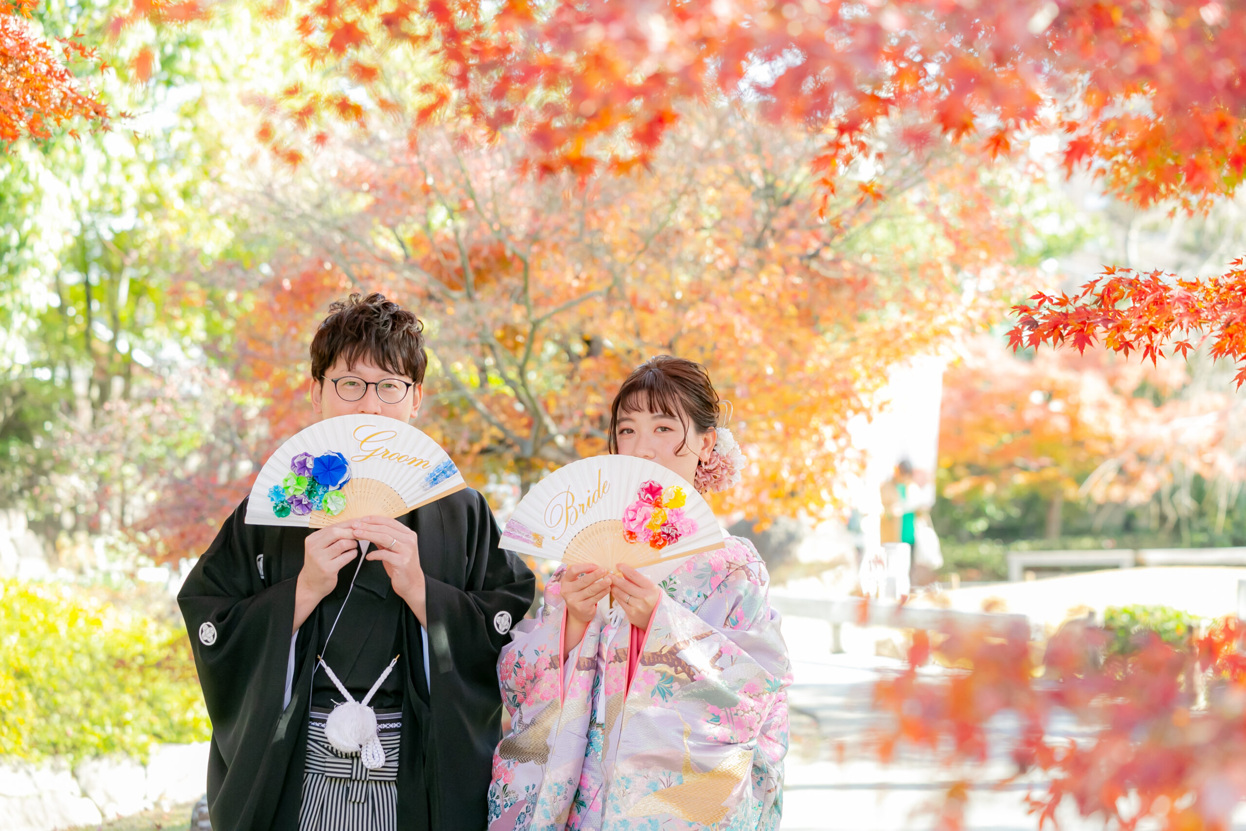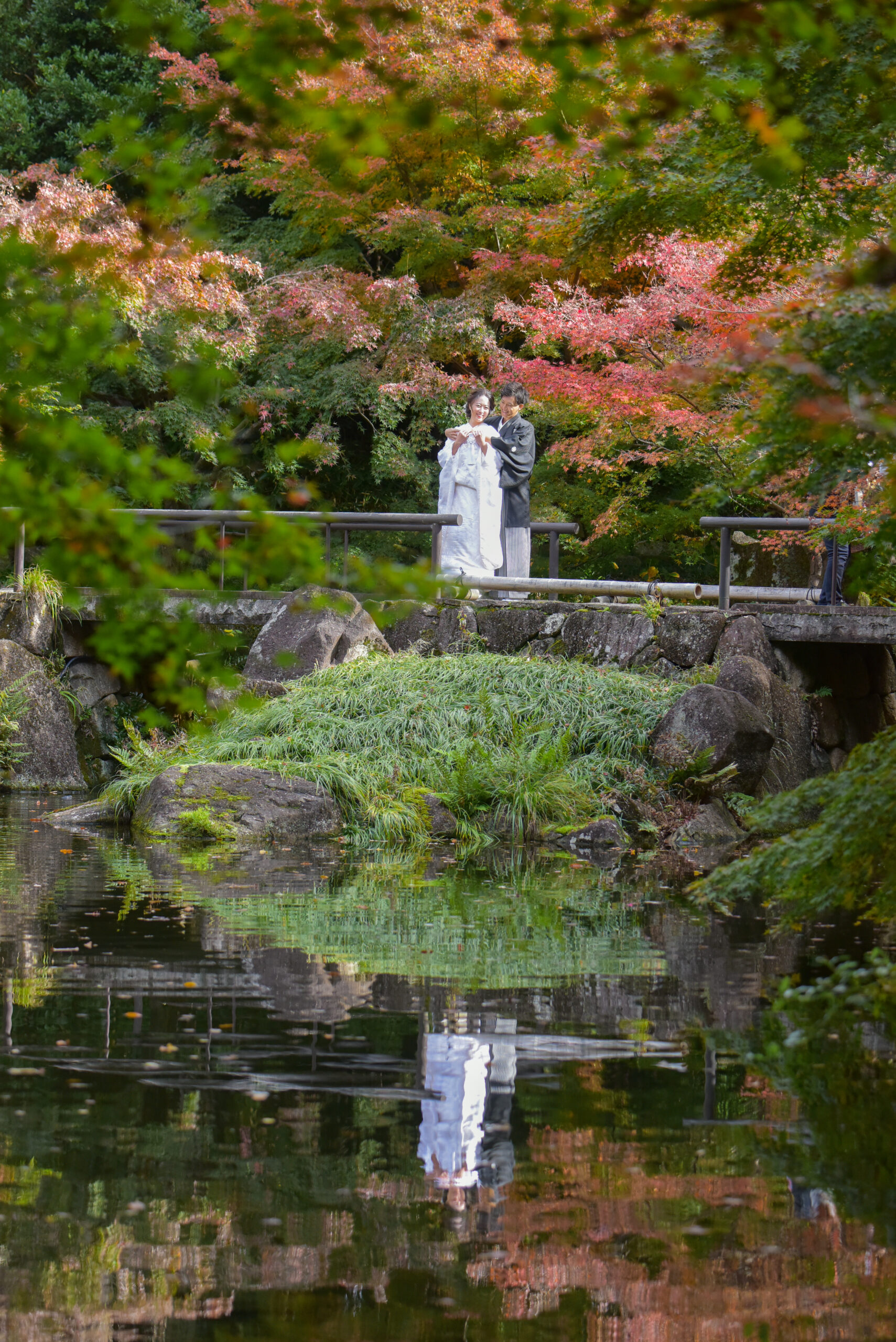 徳川園で和装ウェディングフォト 紅葉に囲まれた新郎新婦 花嫁ヘア