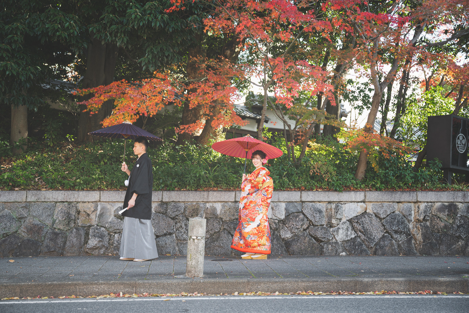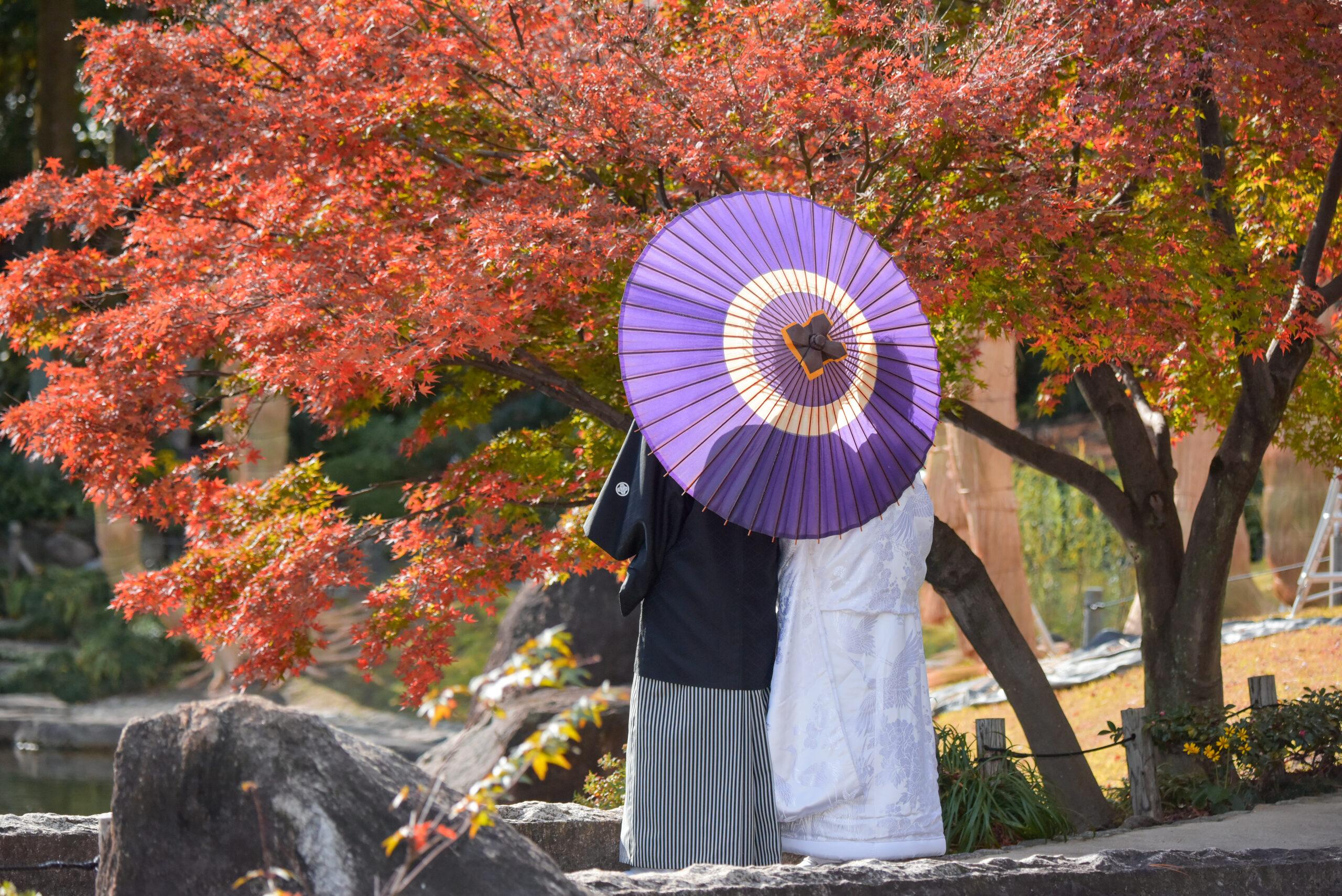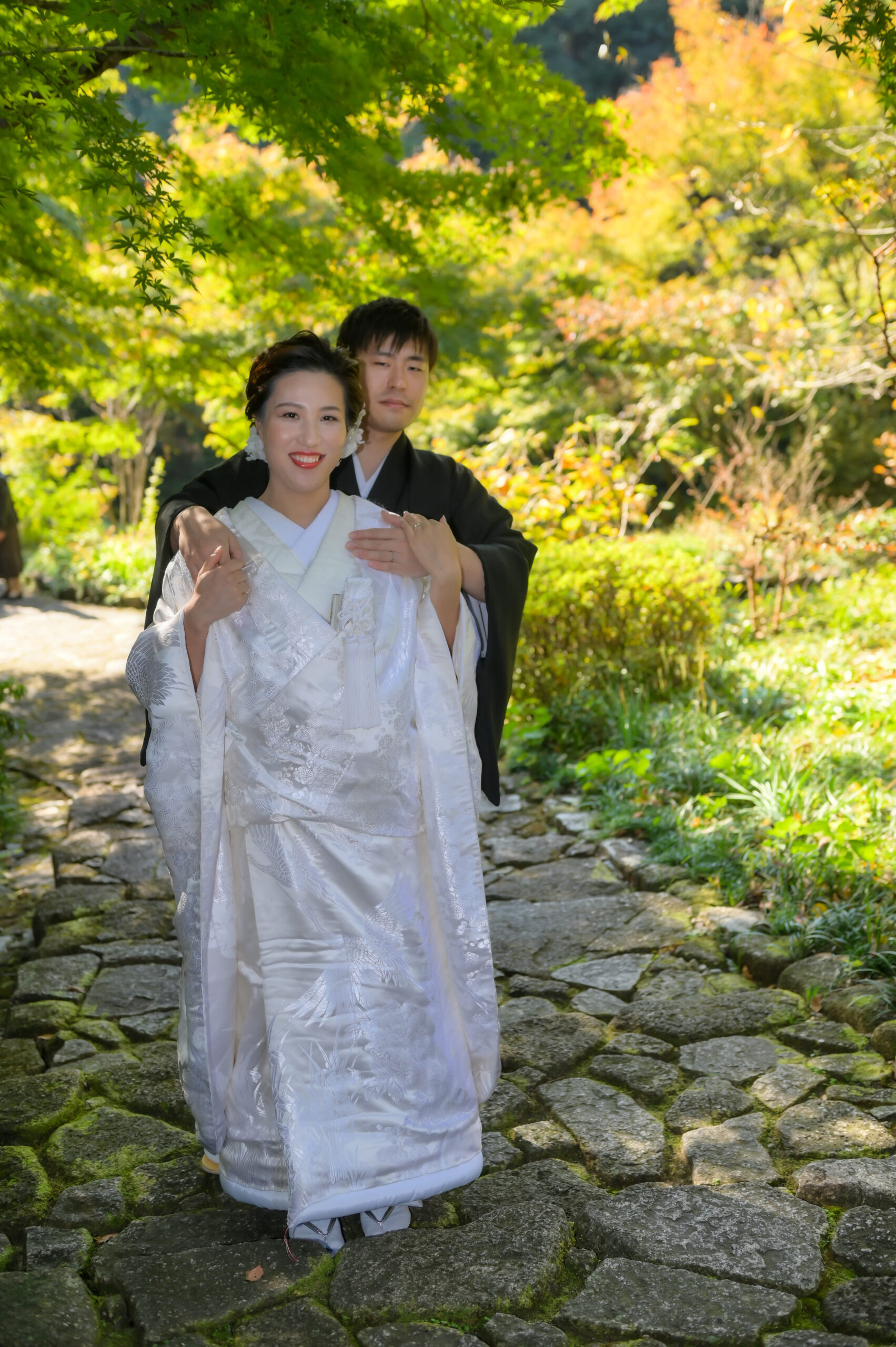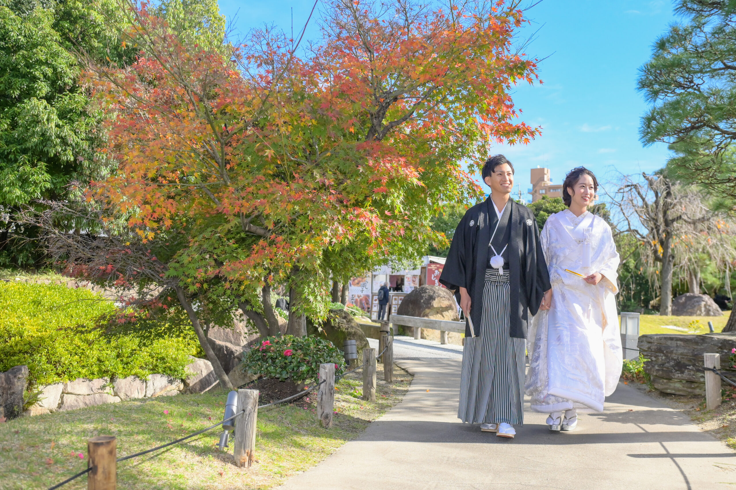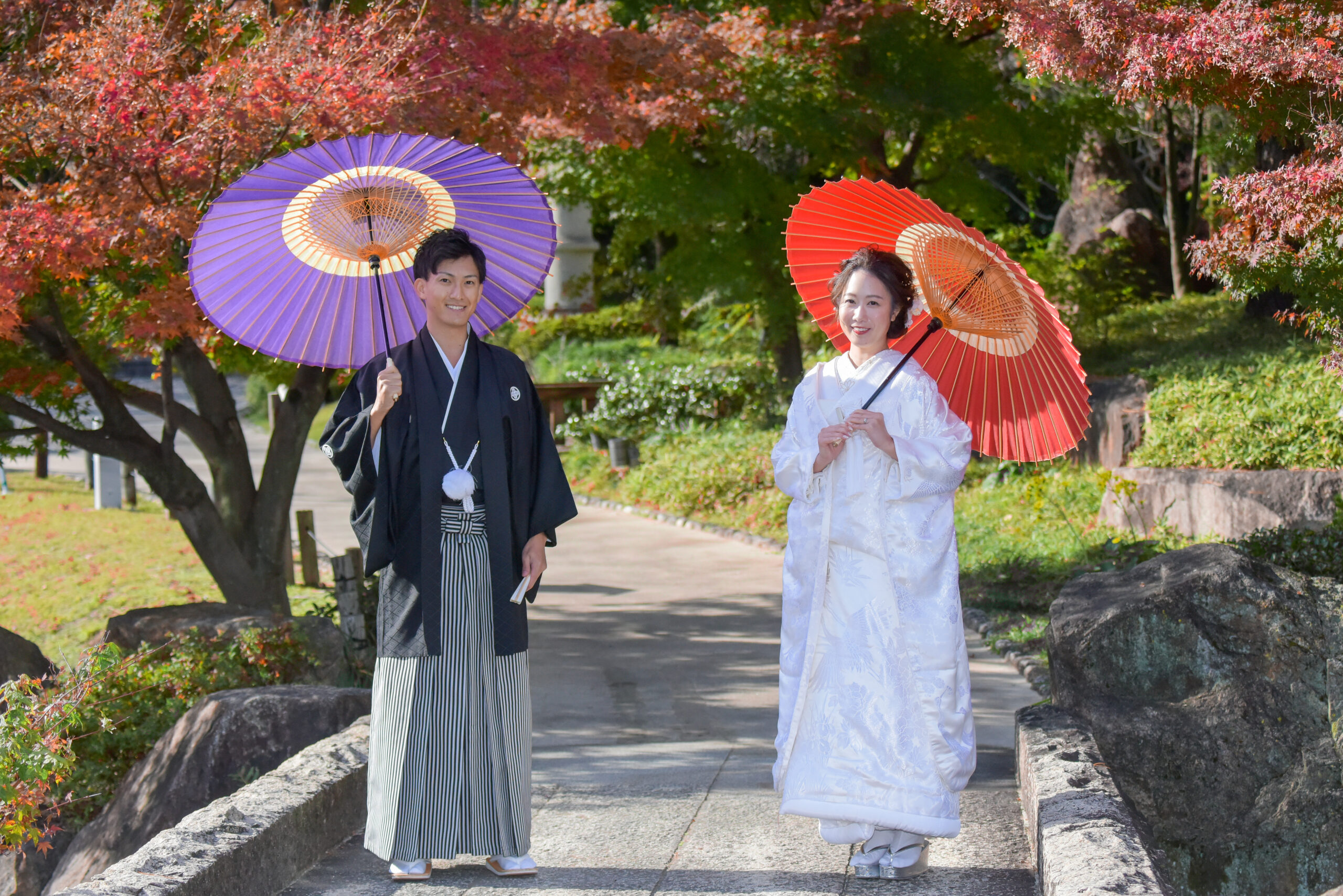 徳川園で和装ウェディングフォト 紅葉に囲まれた新郎新婦 花嫁ヘア