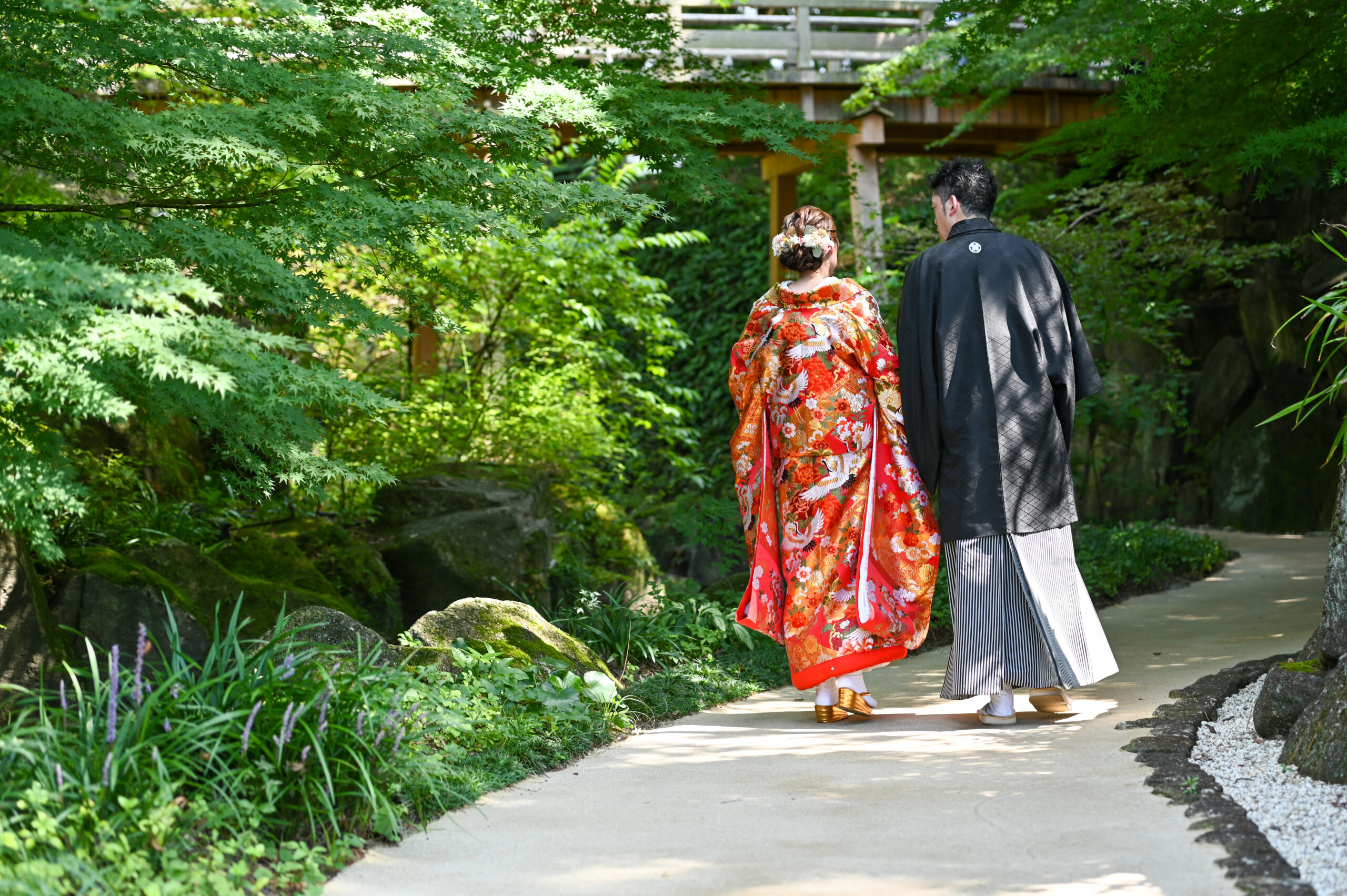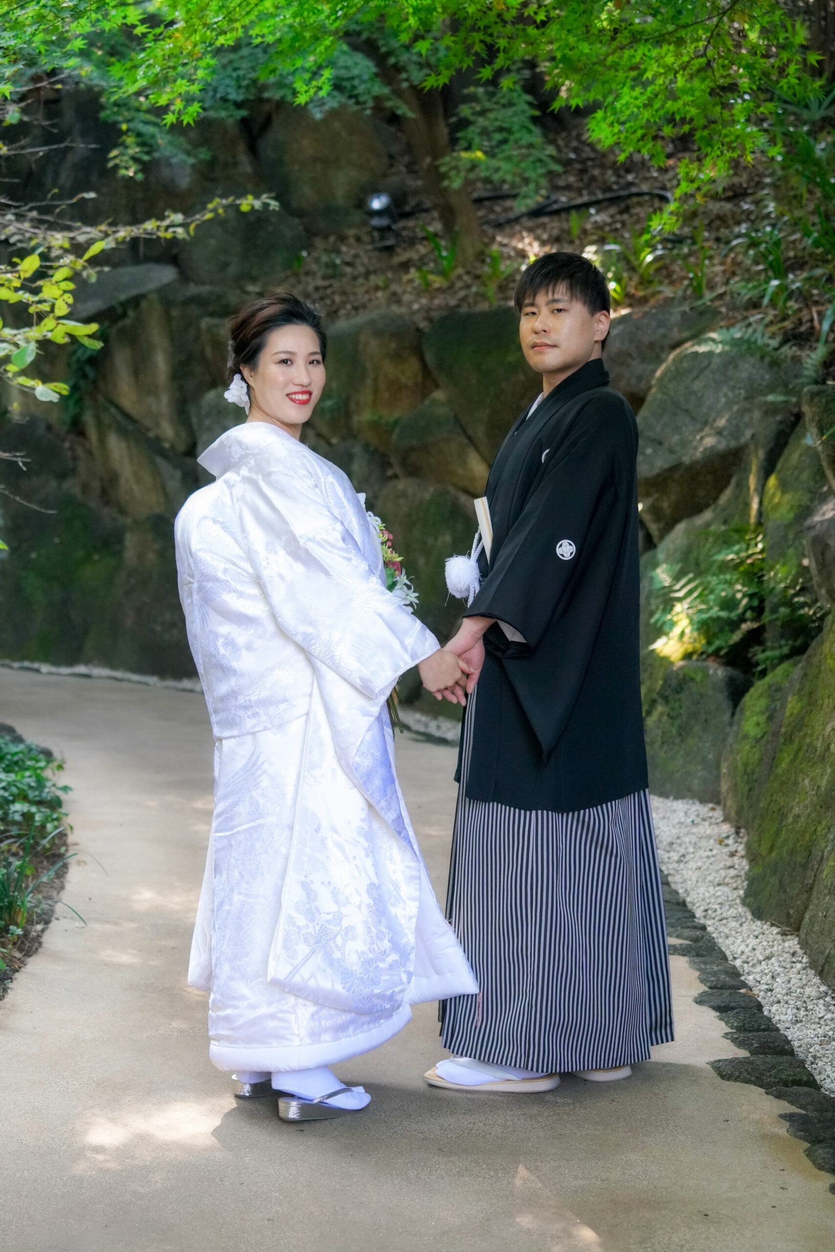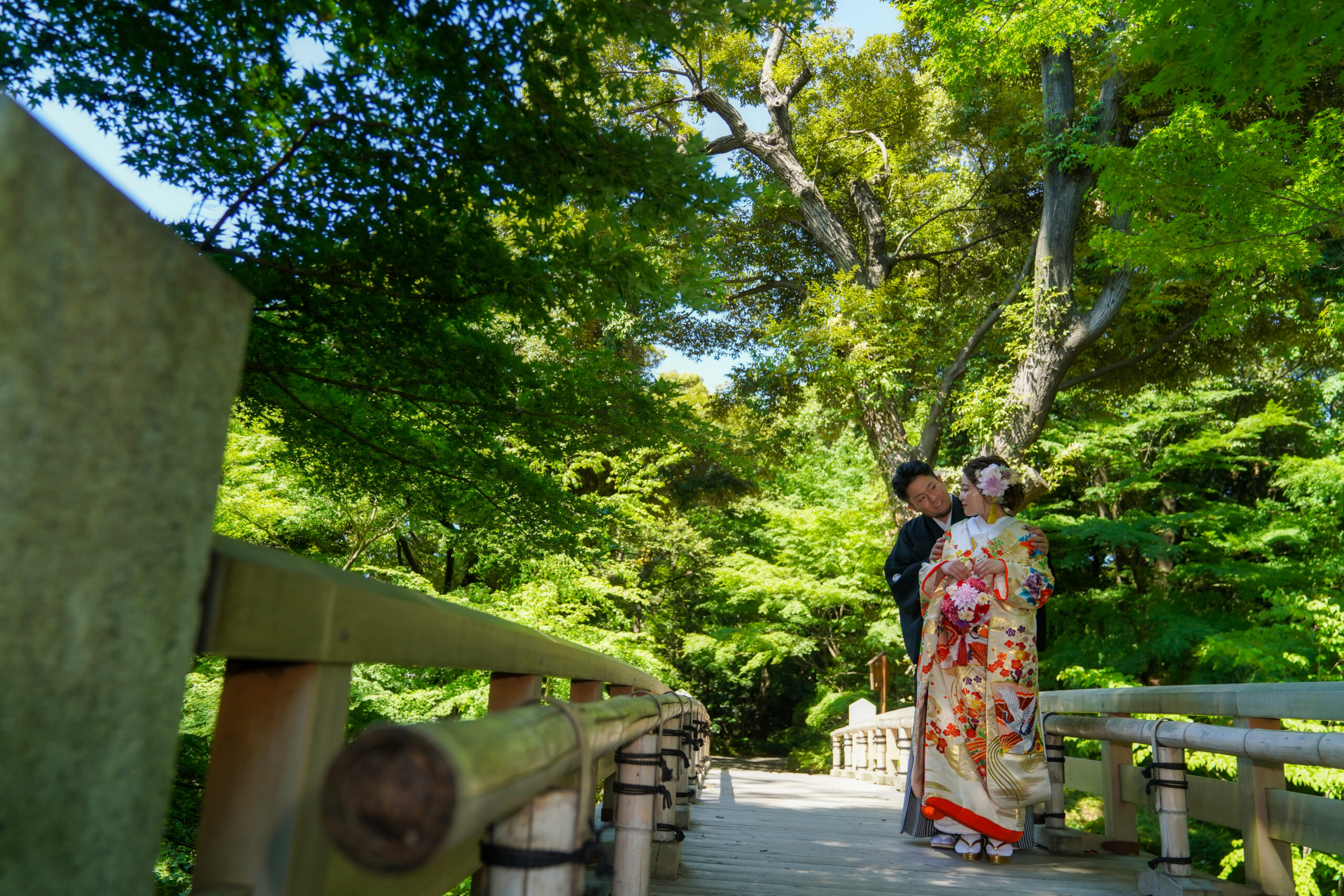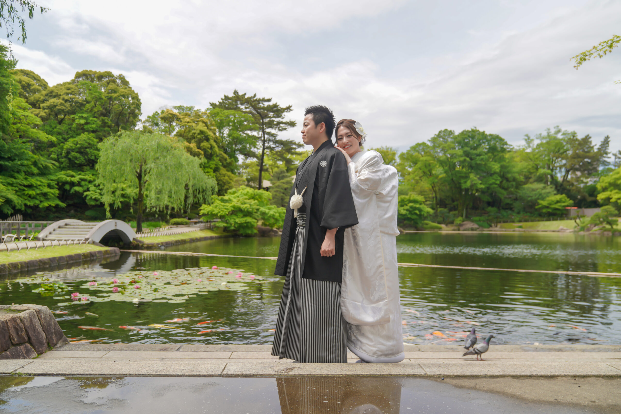 徳川園で和装ウェディングフォト 風景の中に溶け込む新郎新婦