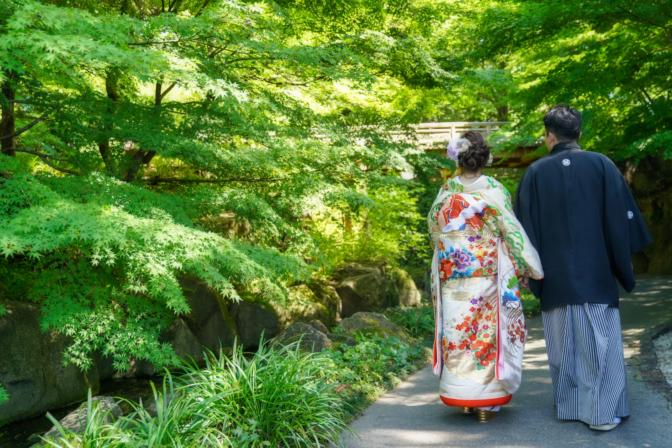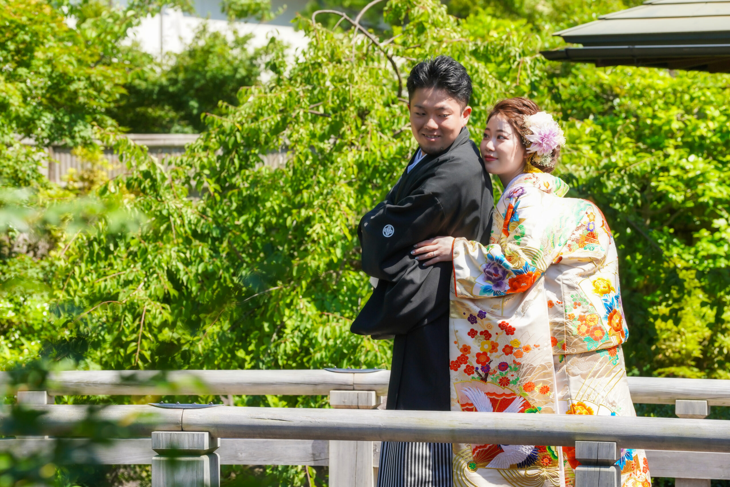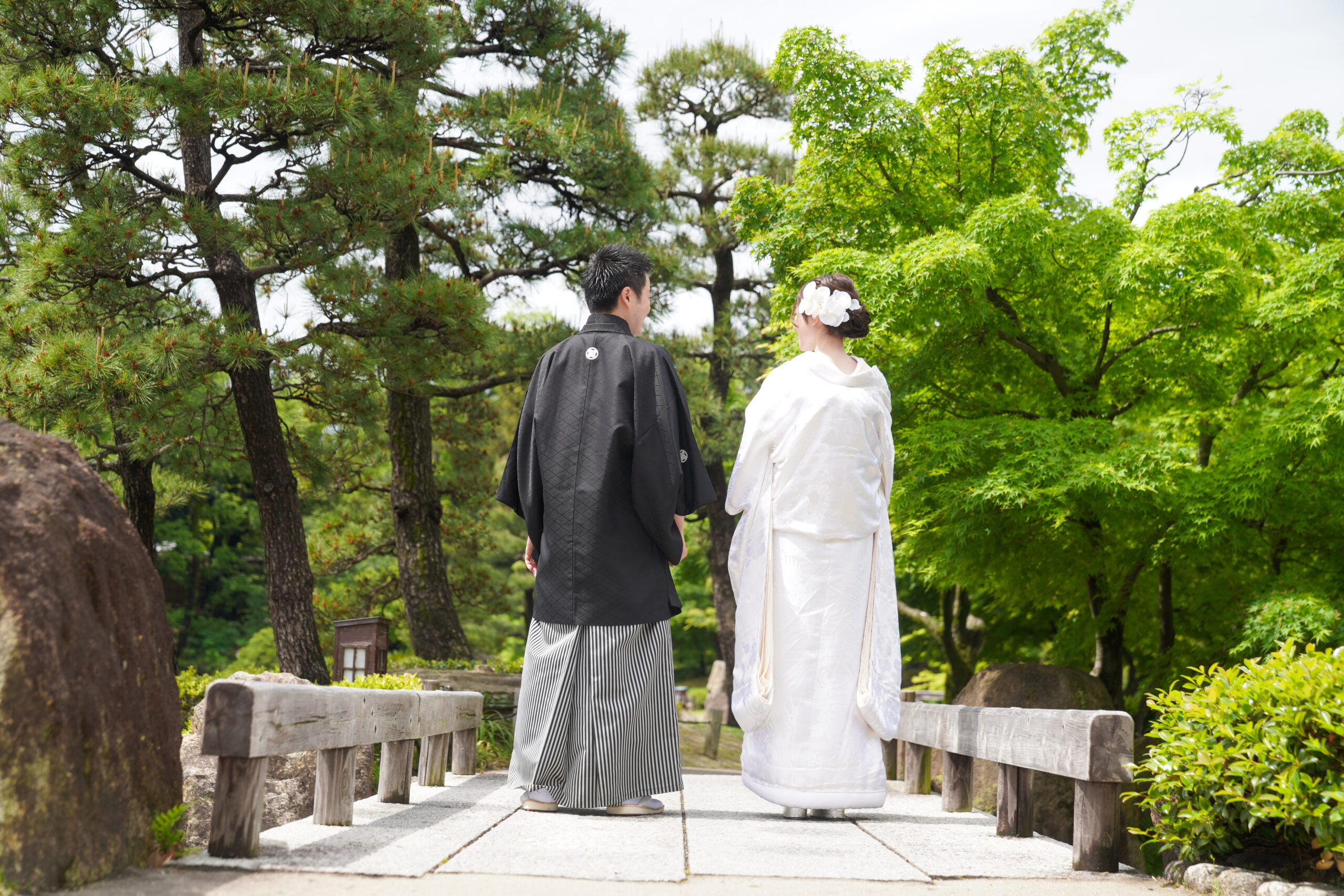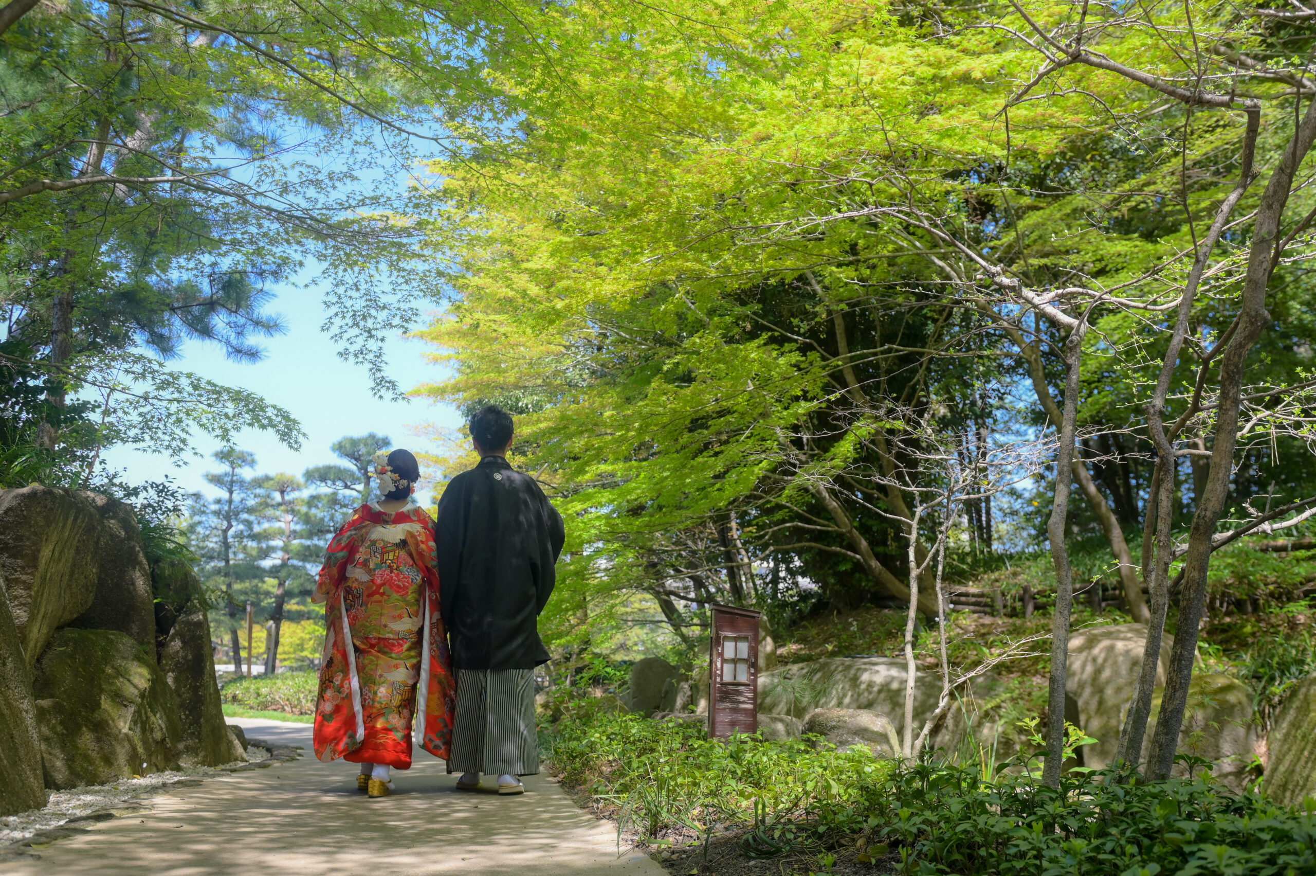 徳川園で和装ウェディングフォト 風景の中に溶け込む新郎新婦