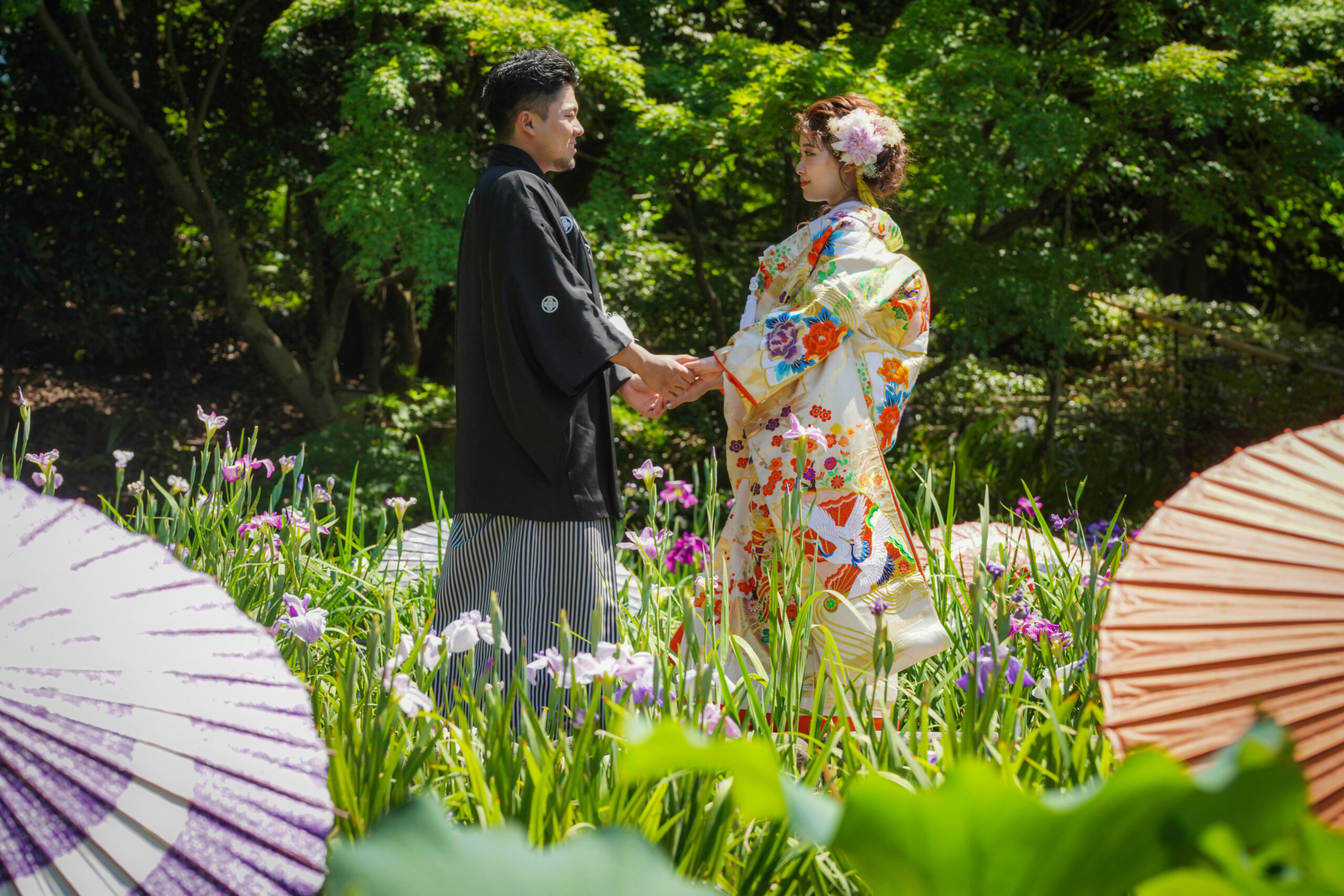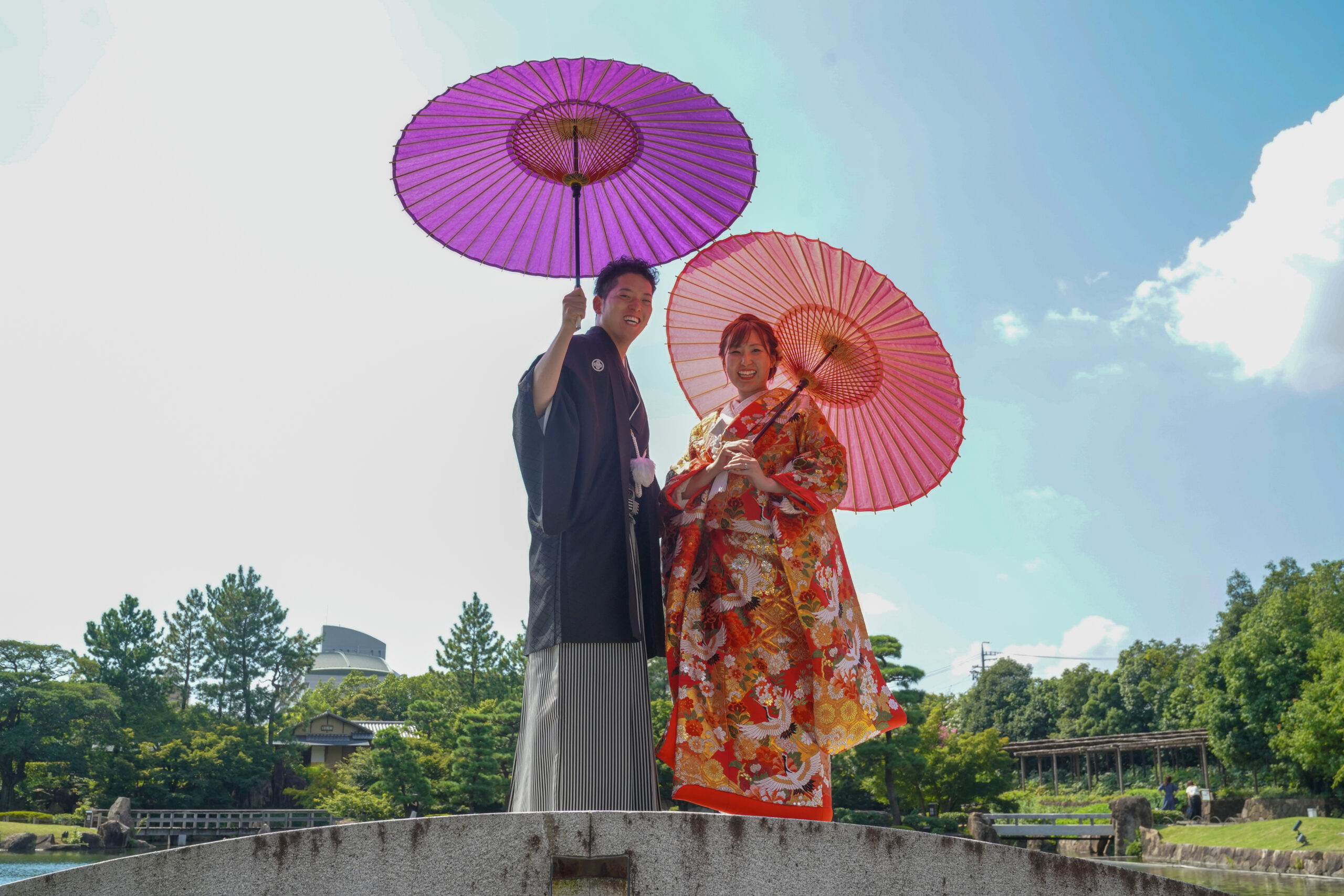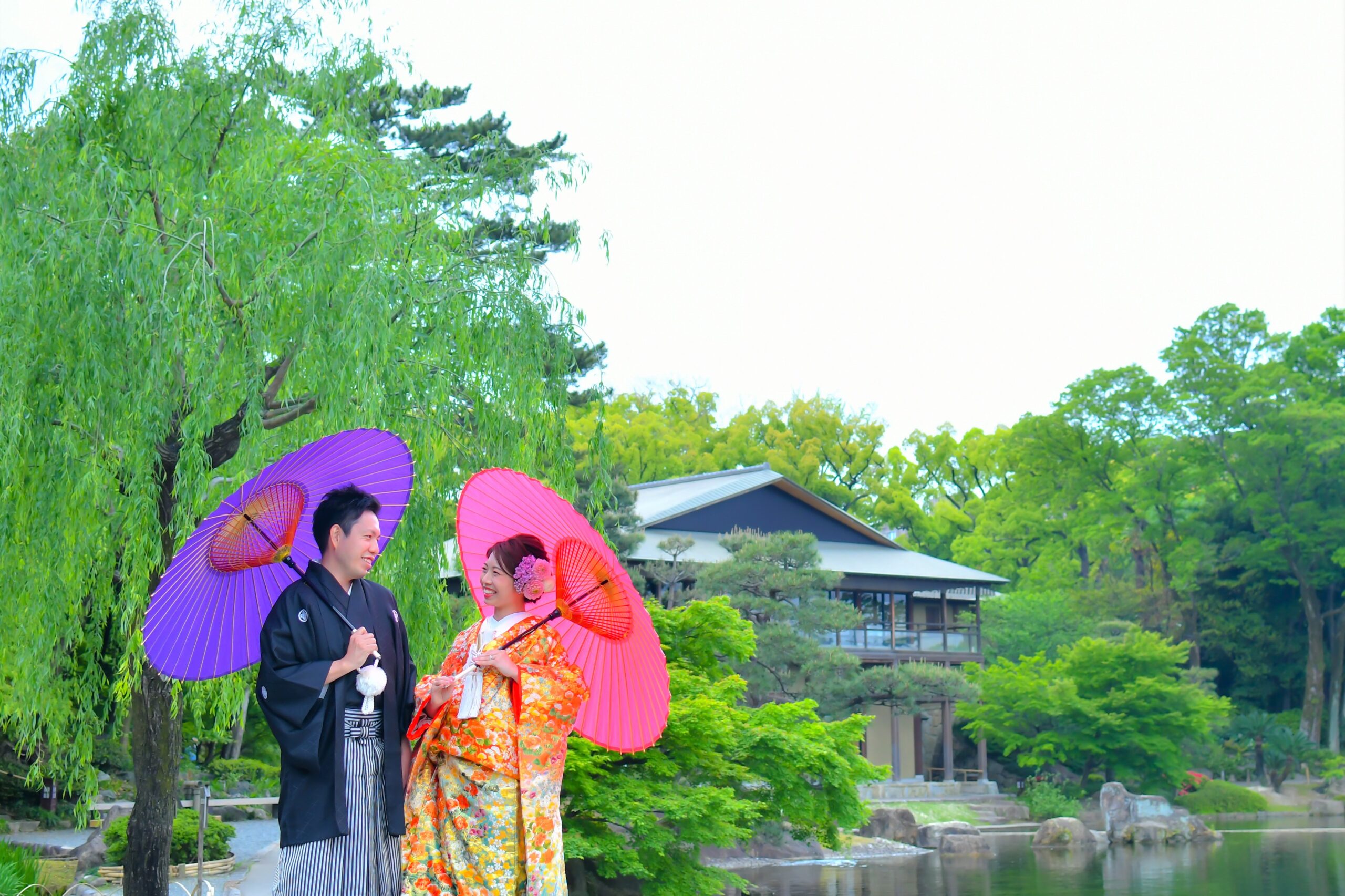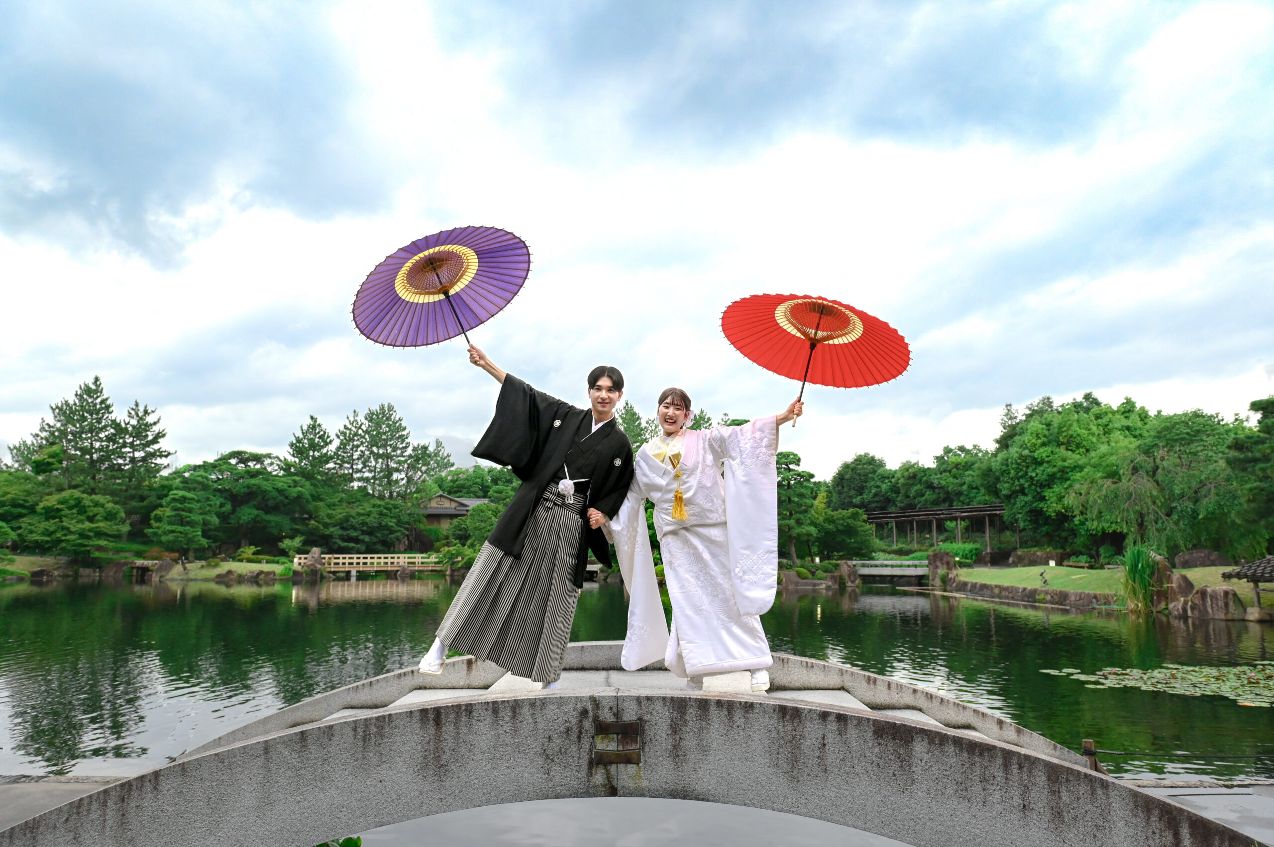 徳川園で和装ウェディングフォト 風景の中に溶け込む新郎新婦