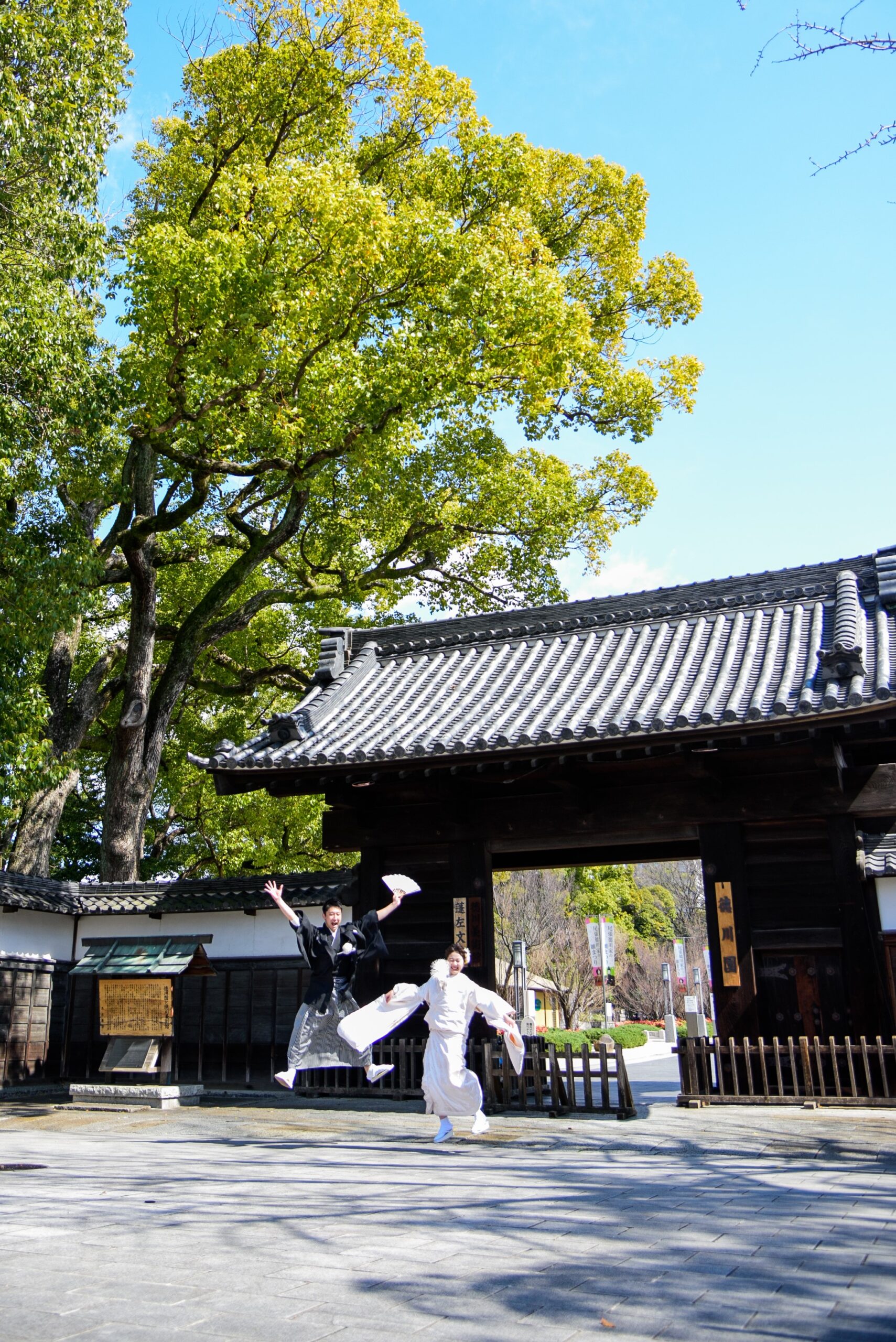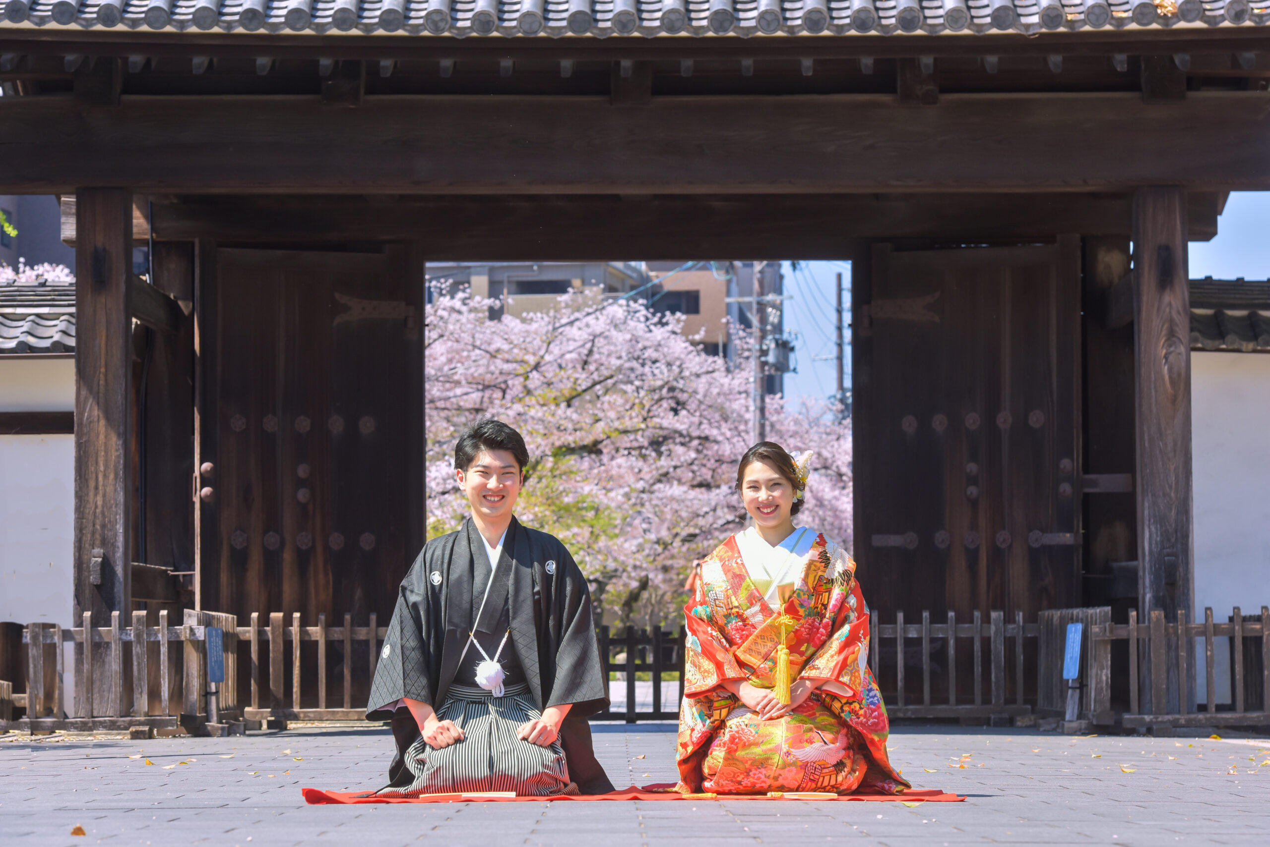 徳川園で和装ウェディングフォト 黒門の前で正座ショット 桜の季節に前撮り