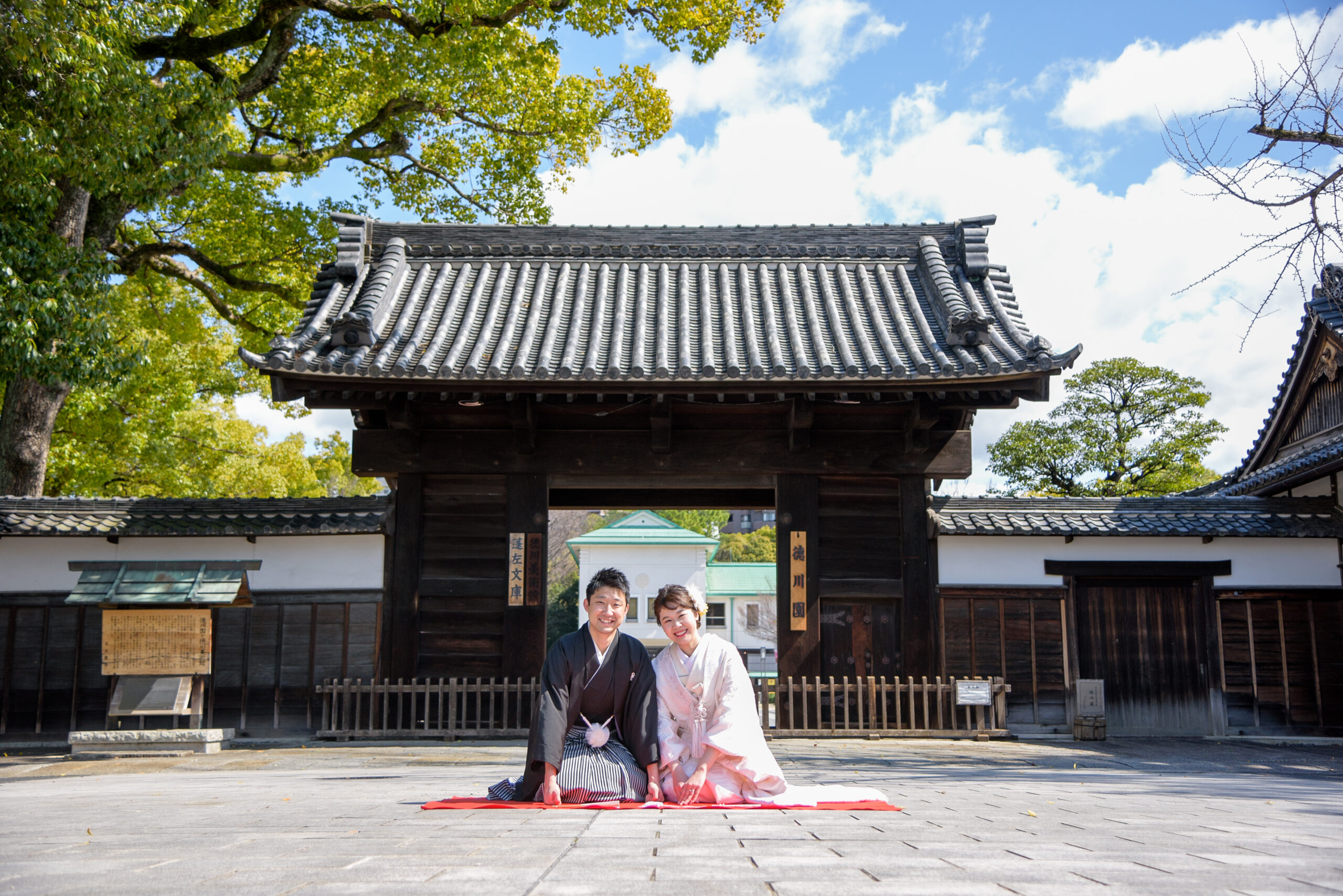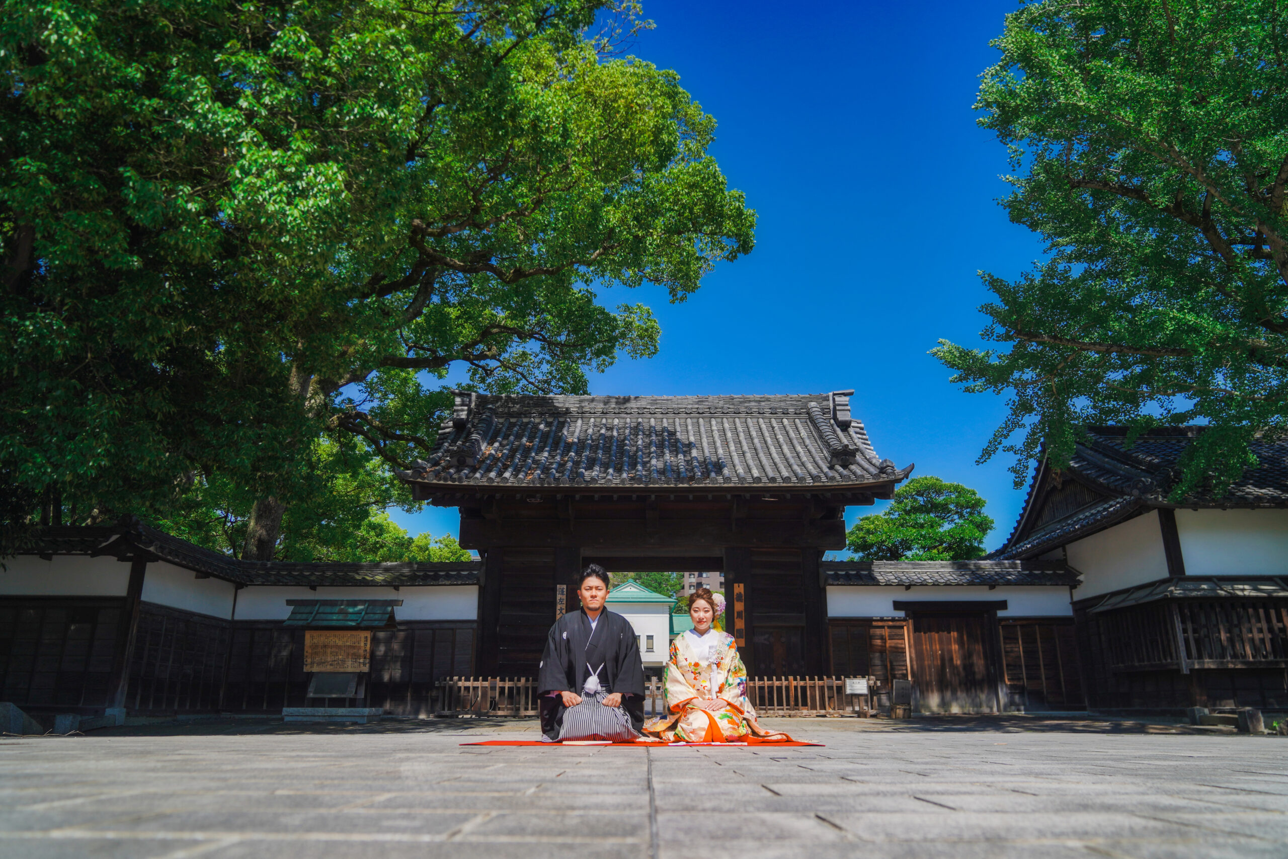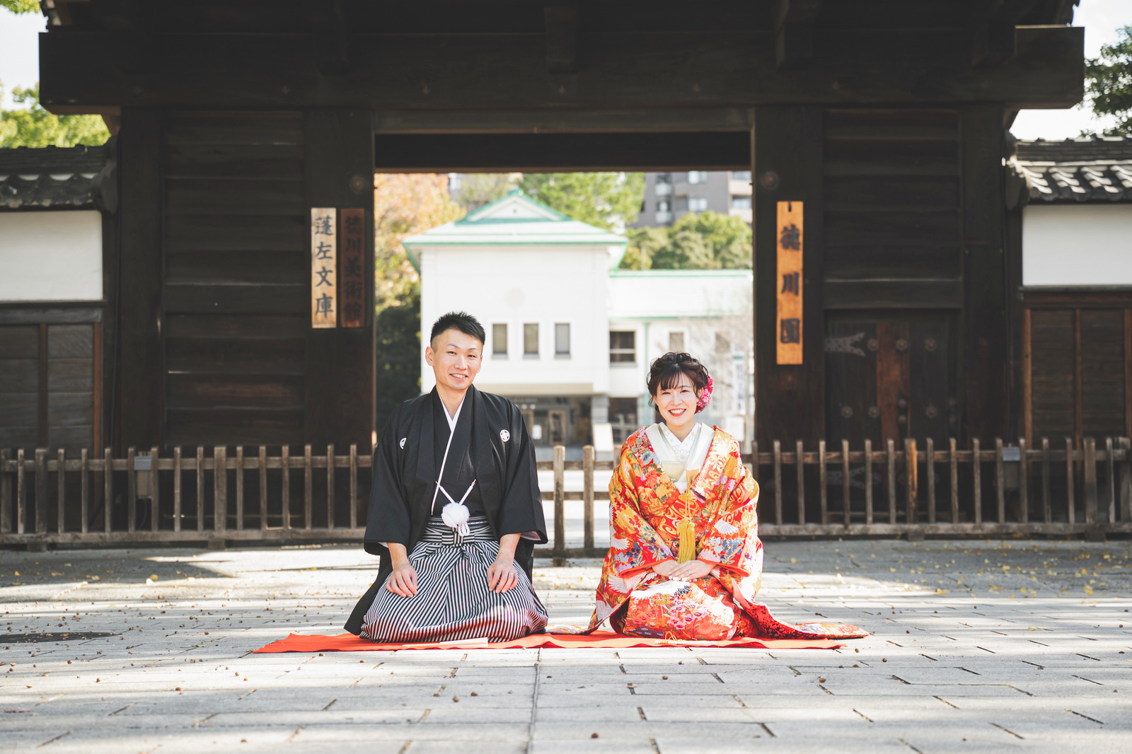 徳川園で和装ウェディングフォト 黒門の前で正座をする新郎新婦 門松