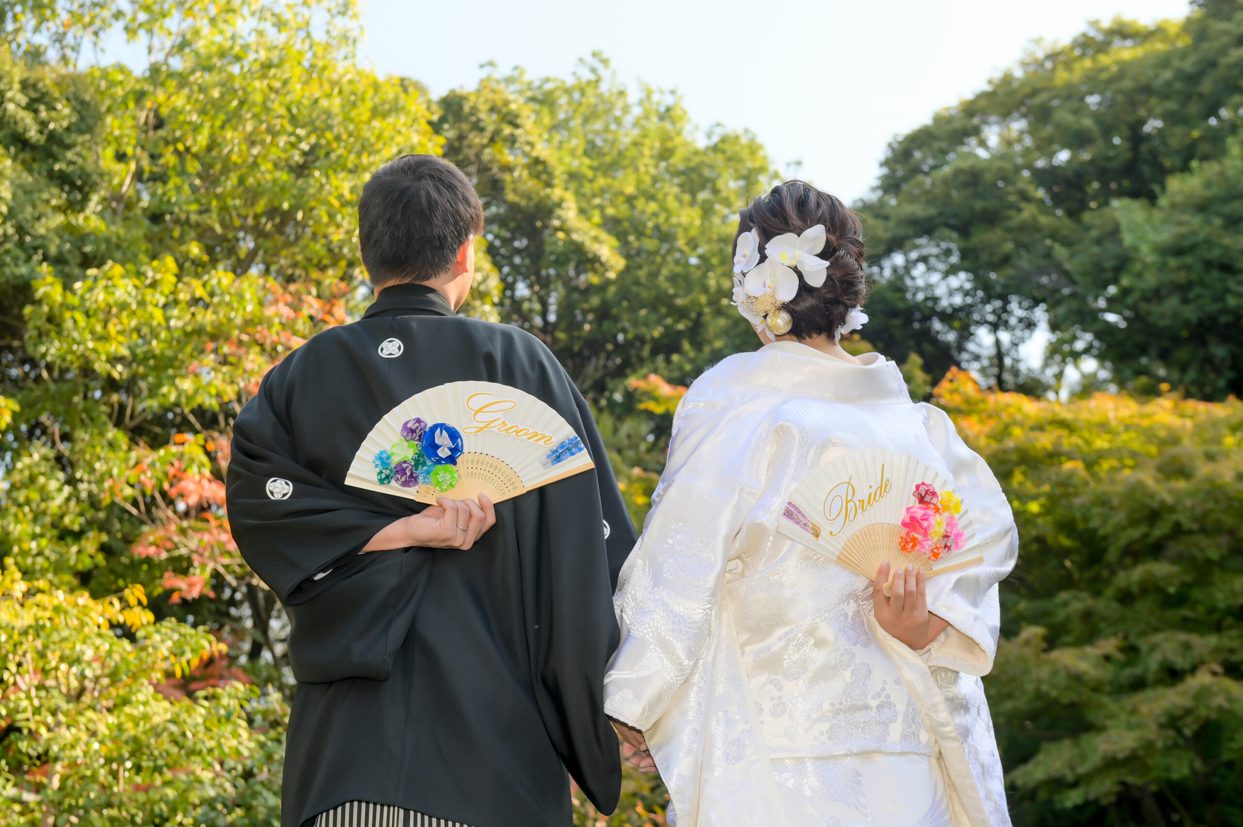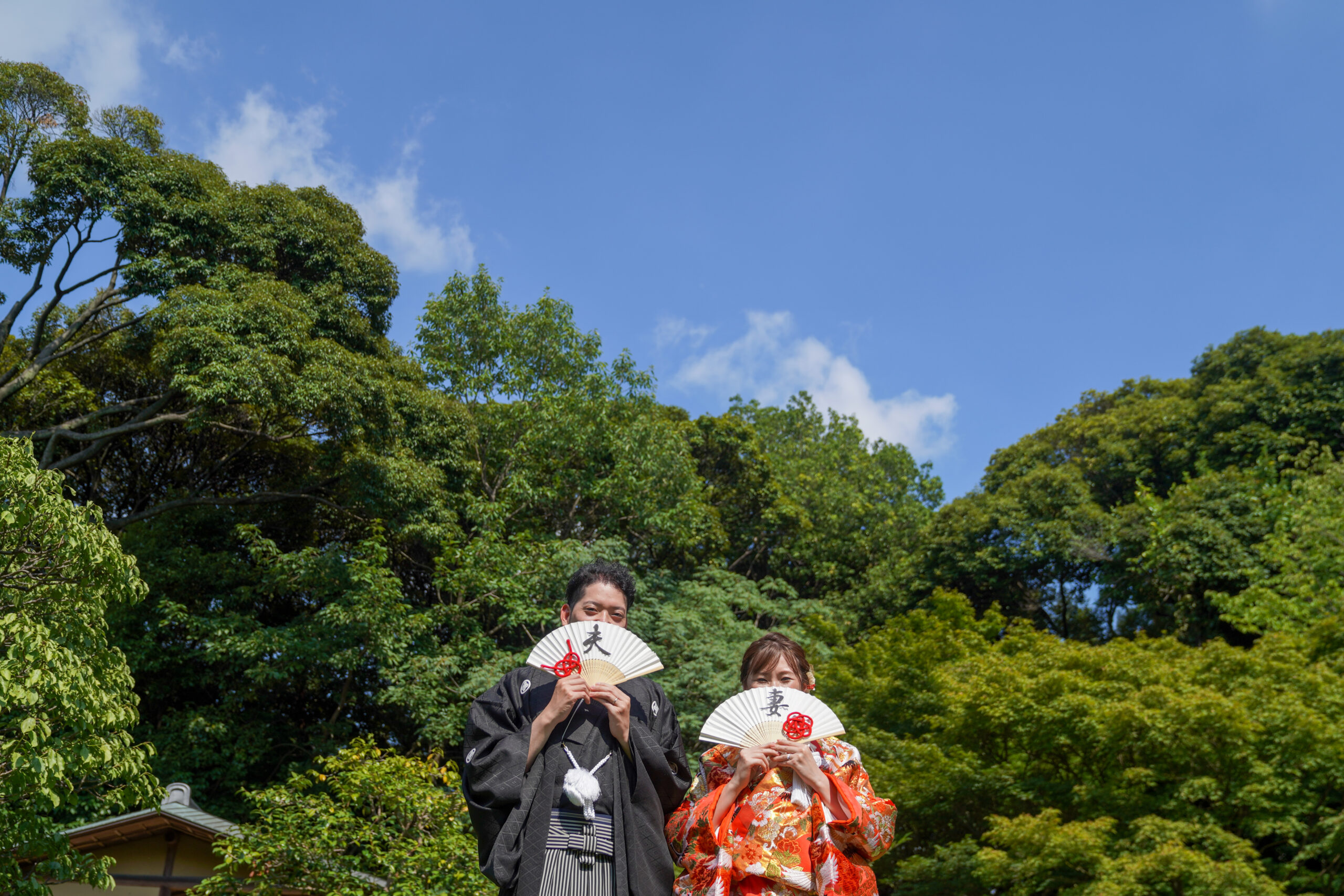 徳川園で和装ウェディングフォト 扇子プロップスを持った新郎新婦 簡単DIY