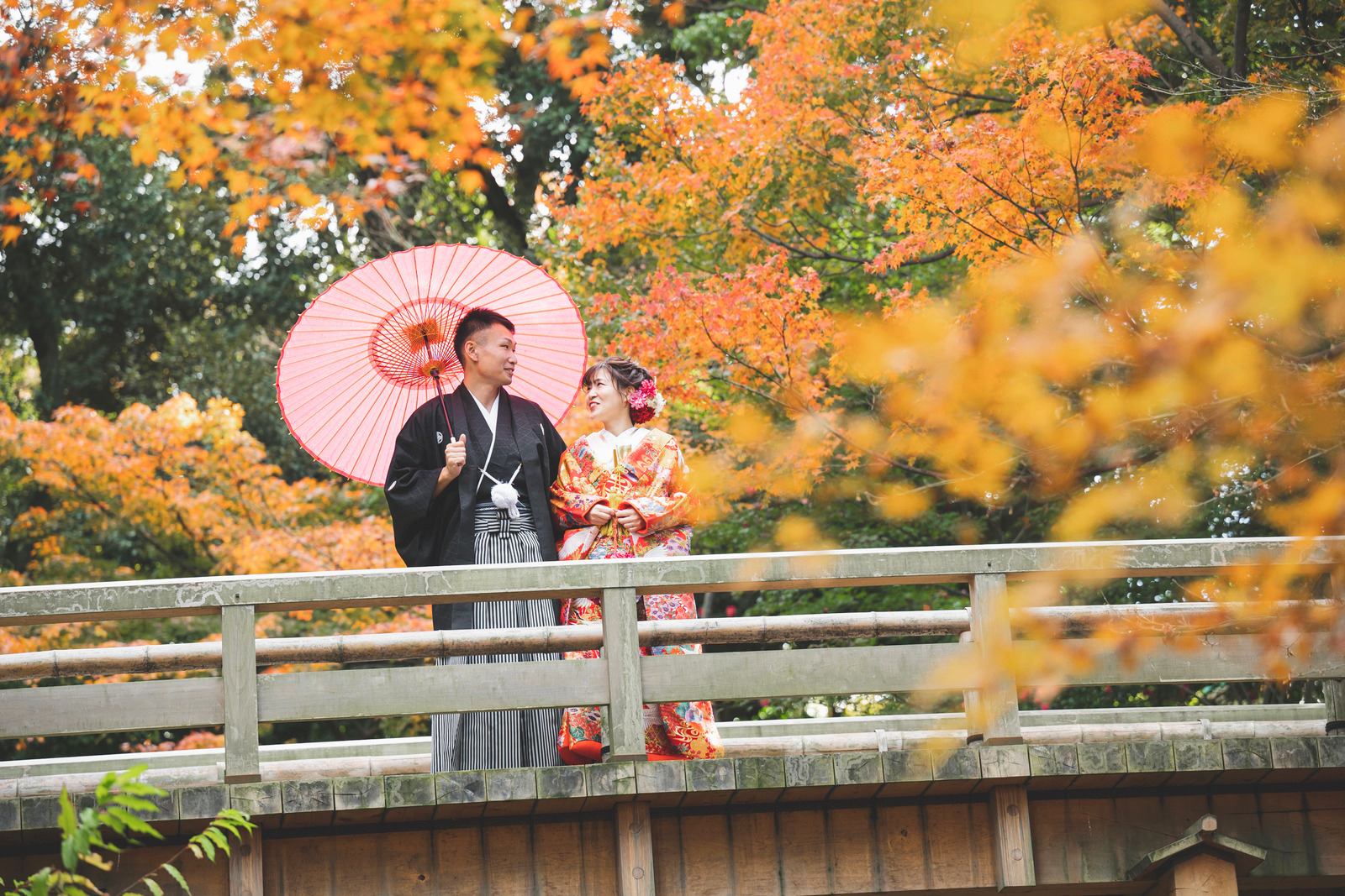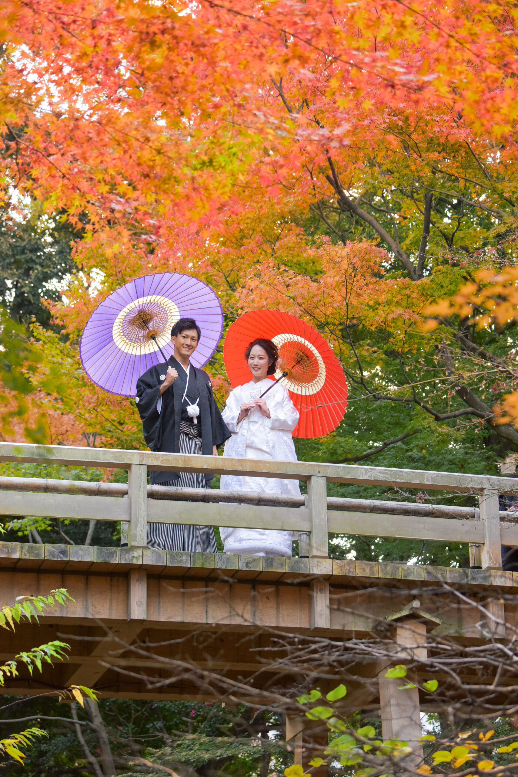 徳川園で和装ウェディングフォト 橋の上で和傘を持つ新郎新婦 紅葉に囲まれて前撮り